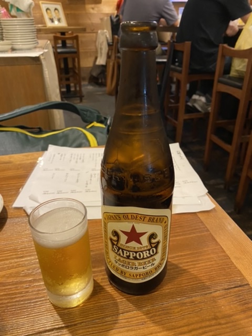 先ずは赤星!サッポロラガービールですね。食べ物は煮込み黒!これは美味しいんですよ。そして茄子の煮浸しに氷下魚。〆の日本酒は和心で!