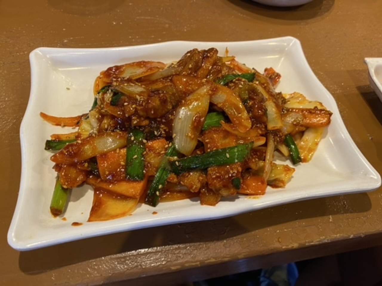 先ずは生ビール!そして豚肉炒めをおつまみに。コチュジャン味でビールに合いますね。そして次はチャミスルで。ナイスです。
