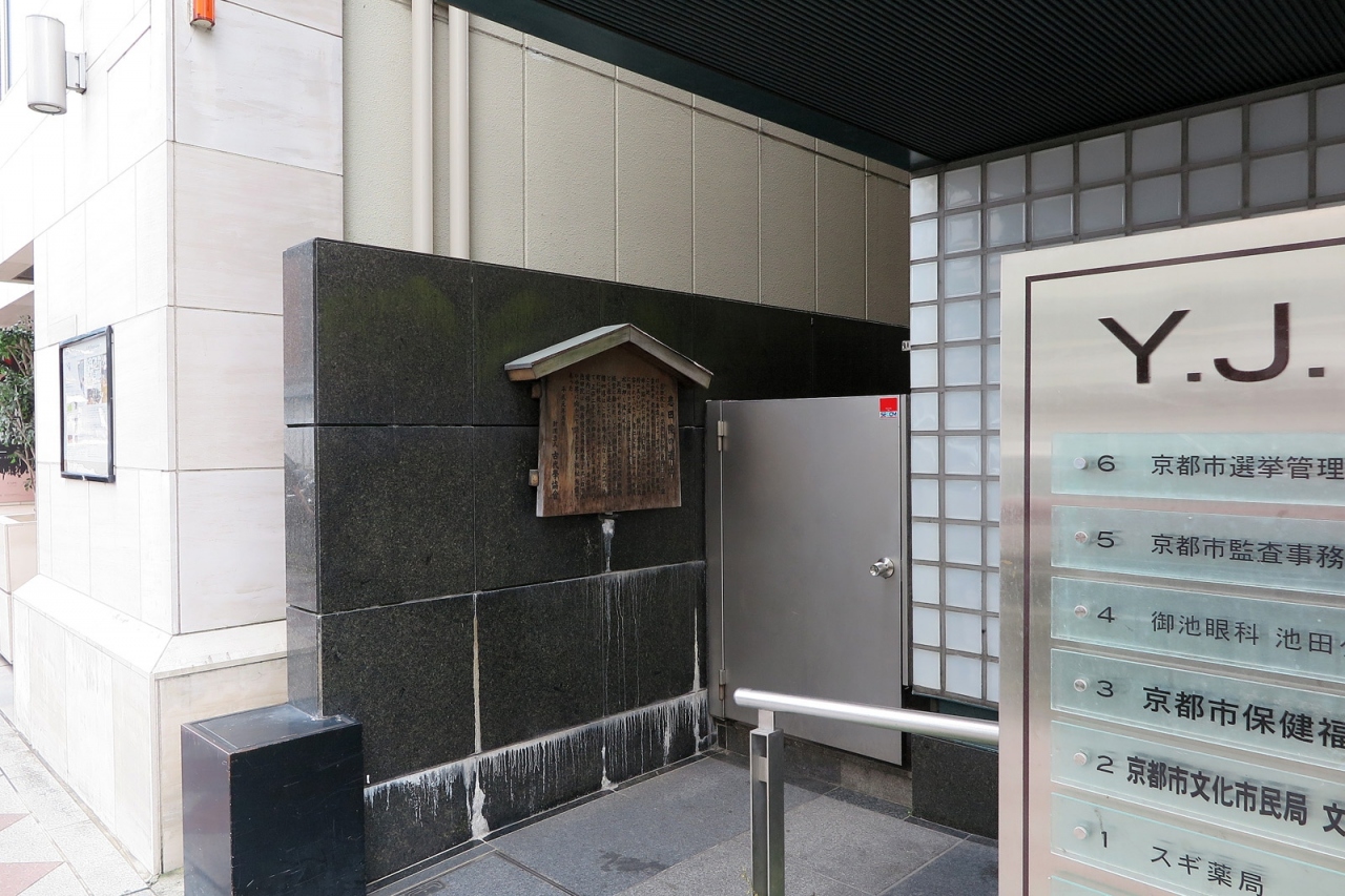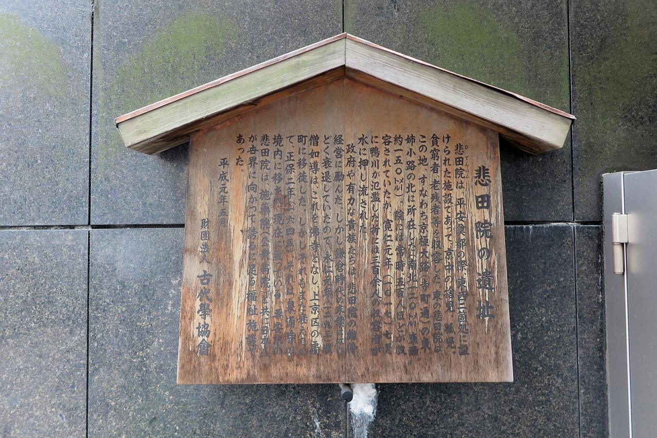 宿泊していた「京都ホテルオークラ」から交差点をはさんで向かい側、スギ薬局の入るビルの片隅に駒札がありました。「悲田院」って、高校時代に日本史で勉強した知識だと、光明皇后が奈良に設置したものということでしたが、各時代・各所にあったんですね。駒札だけで見ごたえはありませんが、新しい知識になりました。