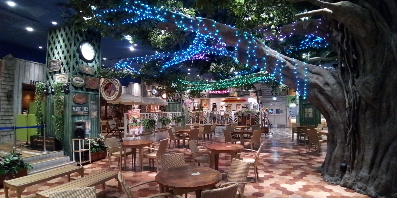 ハワイアンタウンは、みなとみらいの巨大なショッピングモールの横浜ワールドポーターズ内にあって、ハワイ・沖縄系の超おすすめの飲食店が集結しています。2月の寒い時に訪れて、添付写真のように、きれいなイルミネーションがありました。