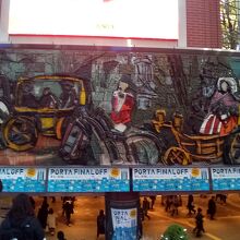 横浜ポルタは、横浜駅東口を出ると直ぐの駅直結型の大規模ショッピングモールです。添付写真のように、開港時の横浜の景色を描いた美しい芸術的巨大オブジェがあるので、絶対見逃せない観光アトラクションだと思います。