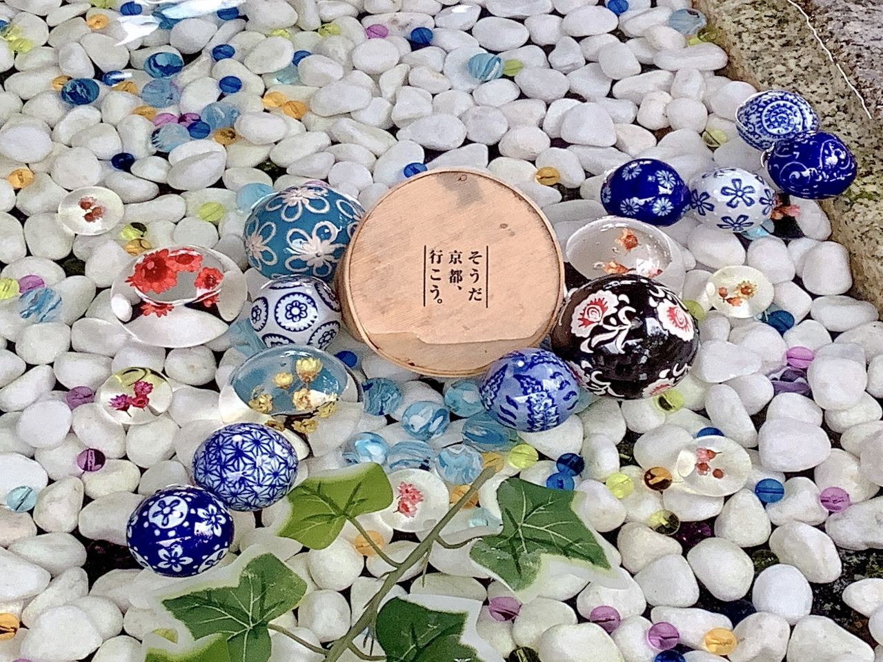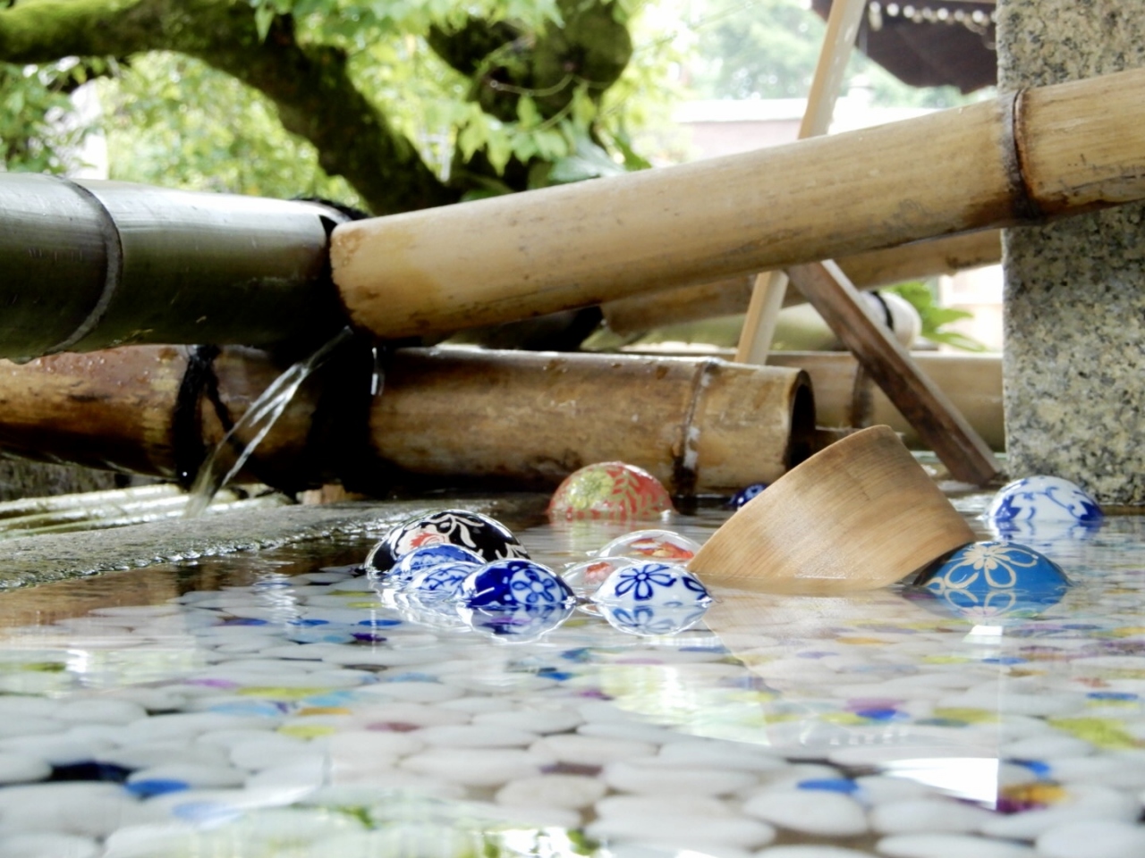花が入ったアクリル玉が彩る涼やかな花玉手水へ様変わり