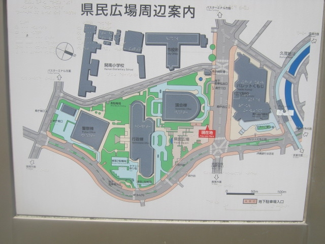 この愛のシーサー公園は、広義でいえば、隣接する県民広場の延長のような感じで捉えられる小公園なのですが、県議会の建物を向かいに丁度、この公園と反対側に県民広場のメインのエリアが広がっていて、ここにちょっとしたユニークなデザインの天井画が配置されている箇所もあり、これがなかなか見応えありますので、併せてご覧になって頂きたいです。