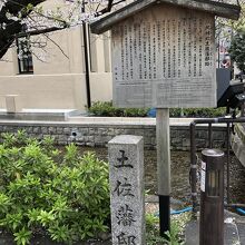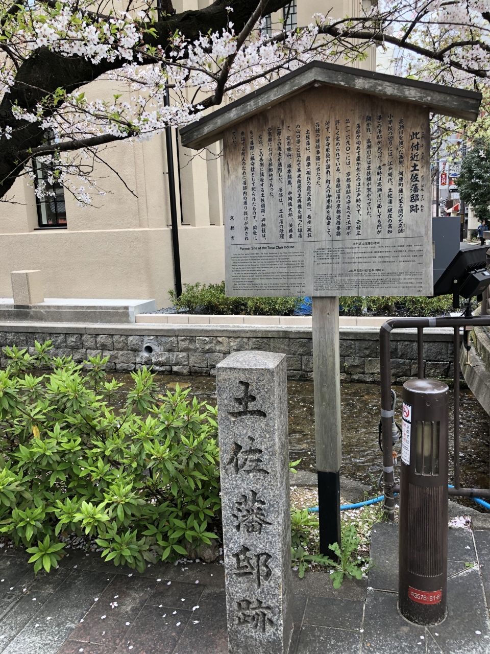 高瀬川が流れる木屋町通り、旧立誠小学校一帯が土佐藩邸跡です。龍馬をはじめ、多くの土佐藩士達も土佐藩邸に出入りしていました。坂本龍馬は、役人ばかりが滞在している京都の土佐藩邸をあまり好まなかったと言われています。満開の桜と高瀬川、とても風情があります。
