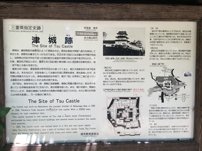 津城は織田信長の弟織田信包によって1580年に築城され、その後津は城下町として栄えてきました。現在は一部の建物(復元)と堀が残っているだけですが、中心にある「お城西公園」周辺には桜、藤棚、アジサイ、紅葉など四季折々の風景を楽しみことができ憩いの場と言えるでしょう。