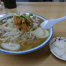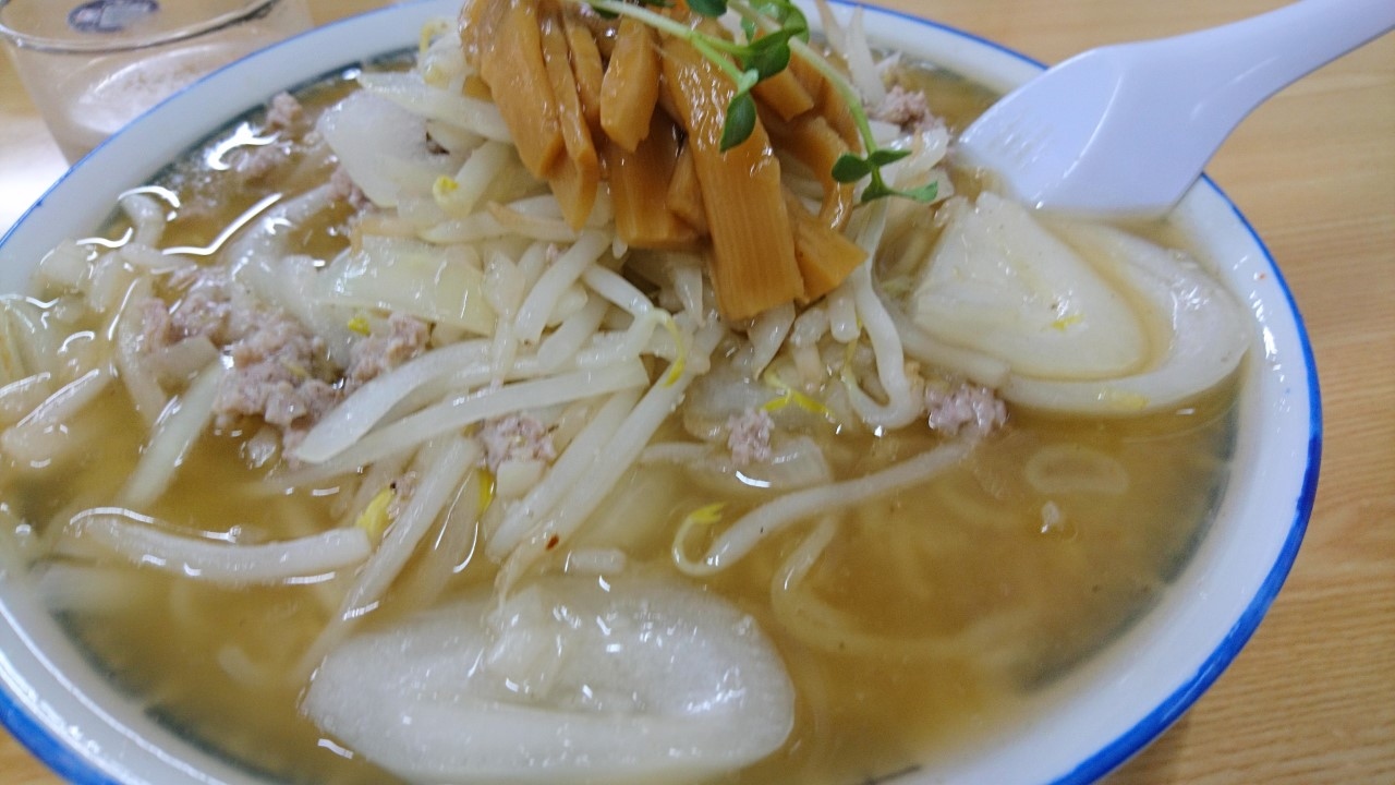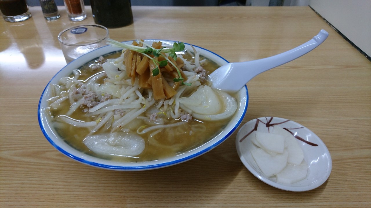 札幌ラーメン発祥の地と言われているラーメン店です。場所は、大丸藤井セントラルという文房具店のビルの4階の一番奥にあります。なんとなく場所がちょっとと言う感じです。店に入ると、おばさんが座る席を指示します。店は結構混んでいます。さすが、札幌ラーメン発祥の地ですね。当然、味噌ラーメンを注文しました。「ラーメンができるまでどうぞ」とダイコンの酢漬けのサービスが。ありがたいです。しばらくして味噌ラーメンが運ばれてきました。モヤシたっぷりの味噌ラーメンです。まずは、スープを一口。コクのある甘みのあるスープです。札幌ラーメンの多くは、ニンニクがガツンときいたたものが多いですが、三平さんは優しい味です。とてもおいしくスープも完食しました。帰りに、シューマイを注文する客が多いのに気づき、今度はシューマイもいただこうと思いました。