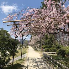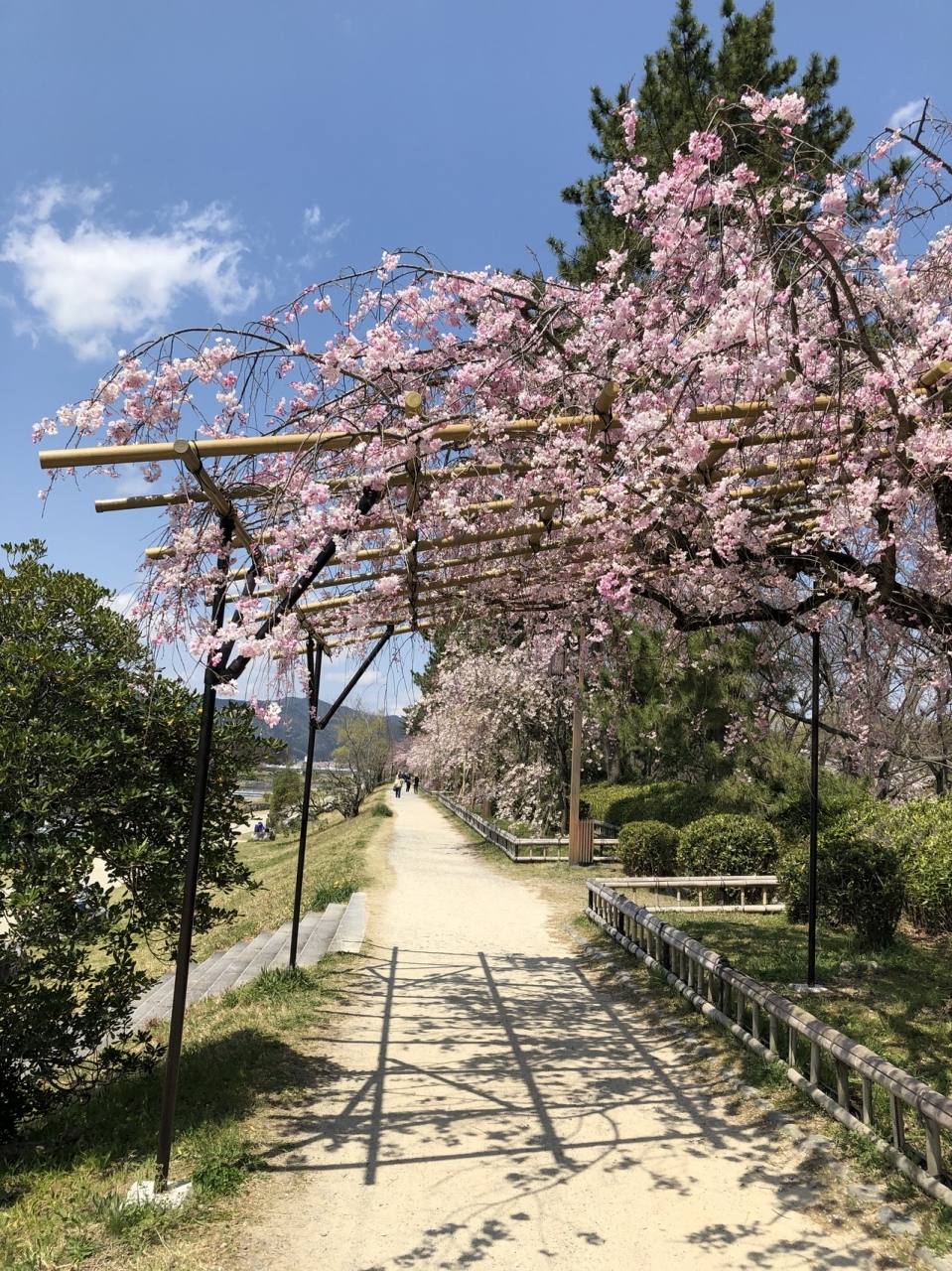賀茂川の北大路橋と北山大橋の間、京都府立植物園沿いに800メートルほど続く小径です。春には八重紅しだれ桜がトンネルのように咲き誇り、桜名所として有名です。2020年4月、コロナで「緊急事態宣言発出」中、例年なら大勢の人で賑わう小径ですがこの日はお天気がいいのに、ほとんどひと通りはありませんでした。桜も心なしか寂しそう。京都府立植物園は閉館していました。