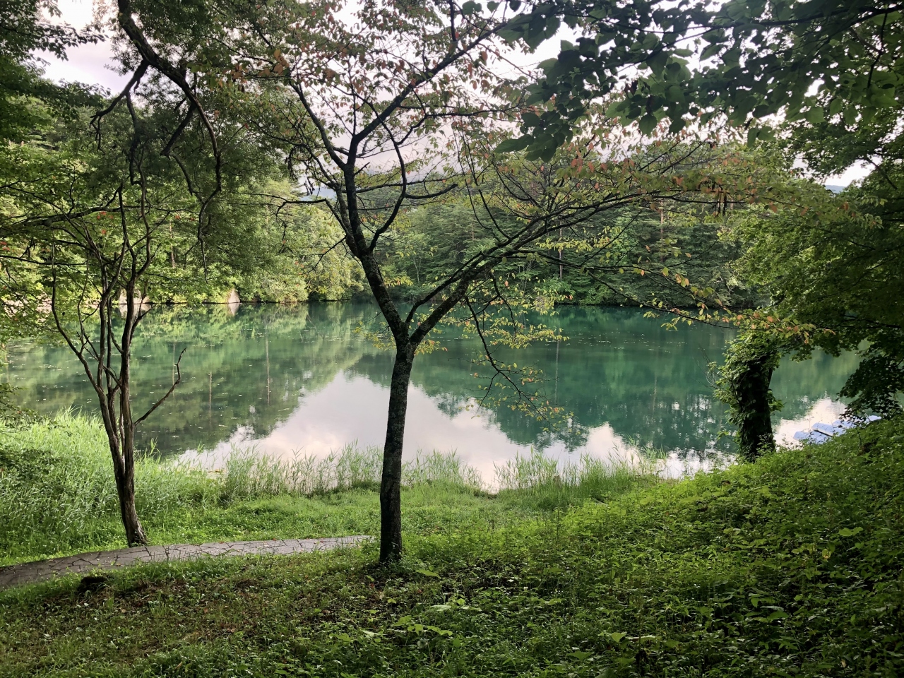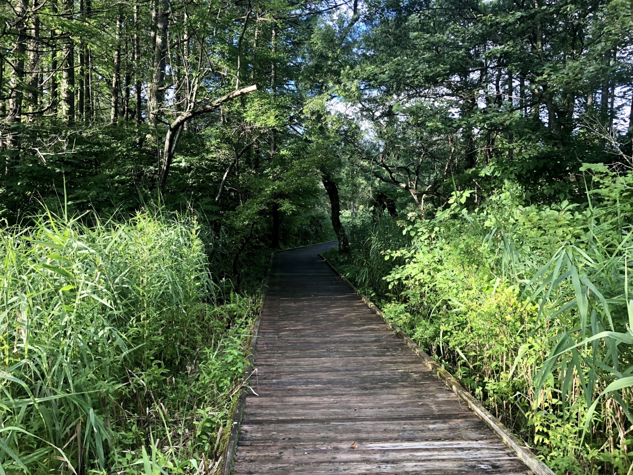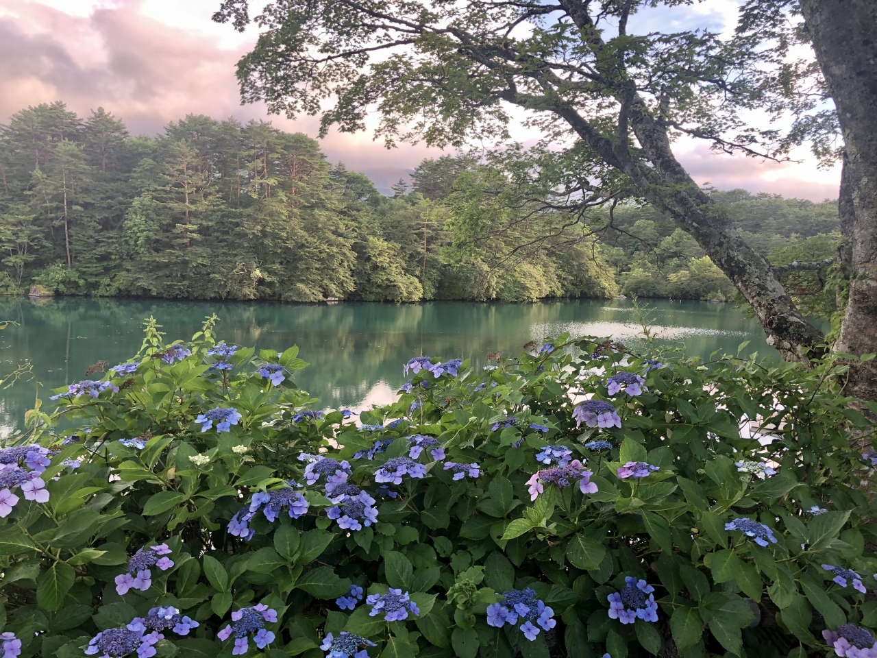 福島市滞在中、尾瀬を訪れた帰途、五色沼のひとつ毘沙門沼に立ち寄った。福島市からは車で約1時間、風光明媚なヘアピンカーブの道が続く。