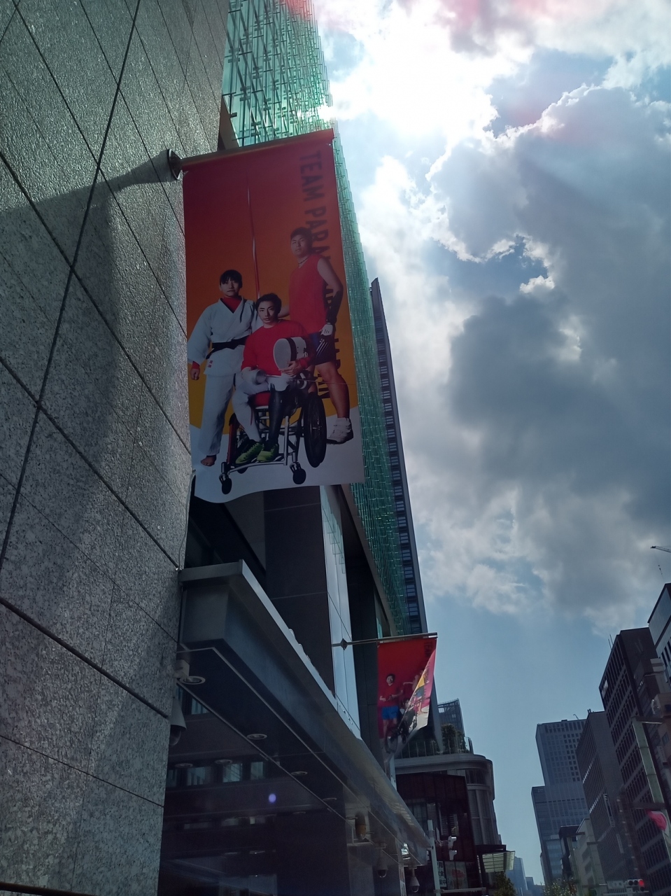 東京 日本橋の交差点にある「コレド日本橋」をおとずれたところは、先月~今月の前半とうって変わって、「TOKYOパラリンピック2020」の旗などが掲げられていました。時折吹く風に旗が棚引き躍動感も出て良い感じです。いつも一生懸命頑張られていらっしゃる方を応援している商業施設です。
