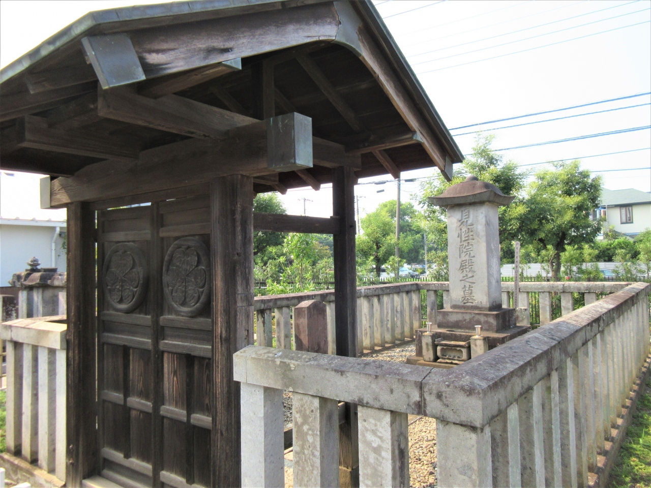 武田信玄の次女見性院が、ご主人の死後、徳川家康の庇護を受けて、旧大牧村を領地として与えられた。それで死後にこの清泰寺に葬られた。門には、徳川家の『三ツ葉葵』の紋が入っています。