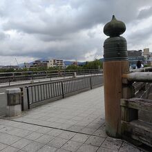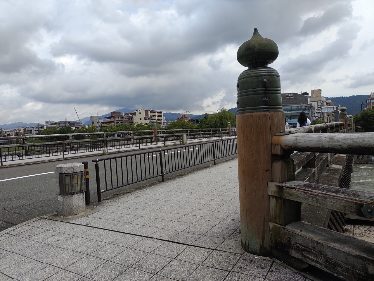 京都の街中にあります。観光客がまばらですがいました。車から降りて、写真だけ撮ってすぐに離れました。いろいろな歴史がある場所で、感慨深かったです。橋のたもとに説明文がありました。鴨川の流れも、暑さを忘れさせてくれました。