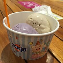 横浜ワールドポーターズ一階のハワイアンタウンの中にあります。ブルーシールは沖縄では定番のアイスで、那覇の国際通りにはお店がいくつもありました。そのブルーシールが横浜でも食べられるのはとても懐かしく、思わず買ってしまいました。ハワイアンタウンの中に沖縄のアイスがあるのは???の感じもしますが、南国風という点で共通しているかもしれません。フードコートのようになっているので、イスやテーブルもありました。