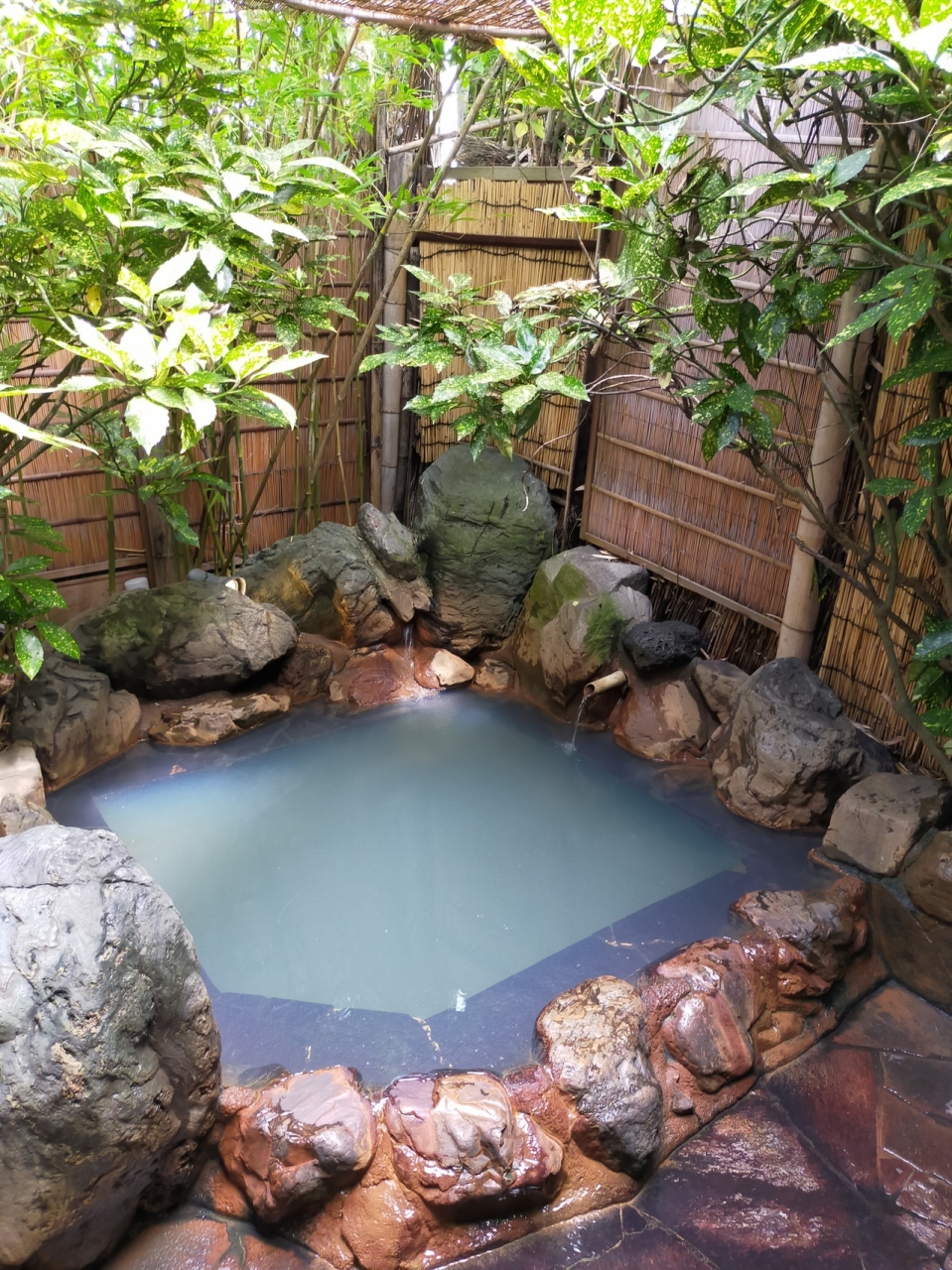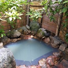 内湯と2つの露天風呂があり、露天風呂は貸切風呂でした。いずれも小さな浴槽で、露天風呂にはカランがなく、桶で浴槽のお湯を汲んで洗う必要がありましたが、小ぶりながら雰囲気の良い風呂でした。お湯は鉄分を含んた良いお湯です。