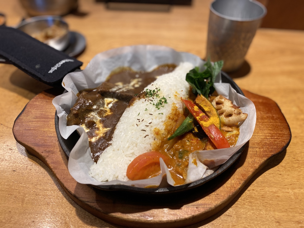 成増駅近くにあるカレーの専門店です。PayPayの還元ということでちょっと高級なカレーを頼んでしまいました。ビーフカレーと野菜カレーのハーフ&ハーフ。ビーフカレーは高級ですが、一番のお気に入り。野菜も撮れて大満足です。