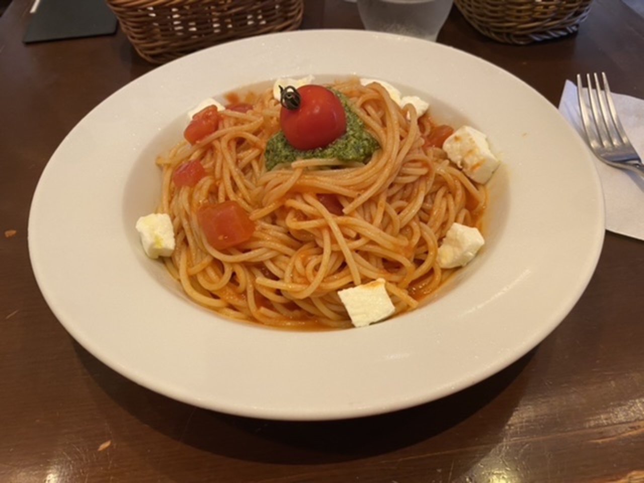 食べたのは冷製トマトソースパスタモッツァレラ・バジルソース添え!夏に登場する冷製パスタ、大好きです(^^)