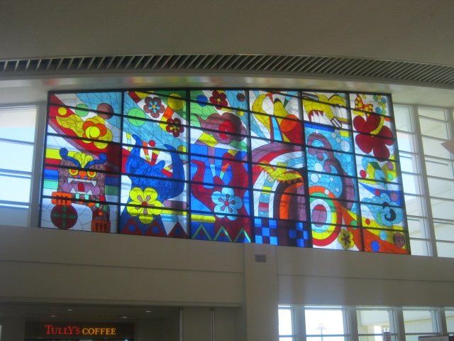 今回は那覇空港からJTAを利用して中部国際空港へと飛びましたが、JAL側のカウンターでチェックインされる際に是非ご覧頂きたいのが、3Fチェックインロビーの上方にあるステンドグラスです。沖縄らしい艶やかなデザインで、旅の最後に沖縄テイストを感じるのにお勧めです。