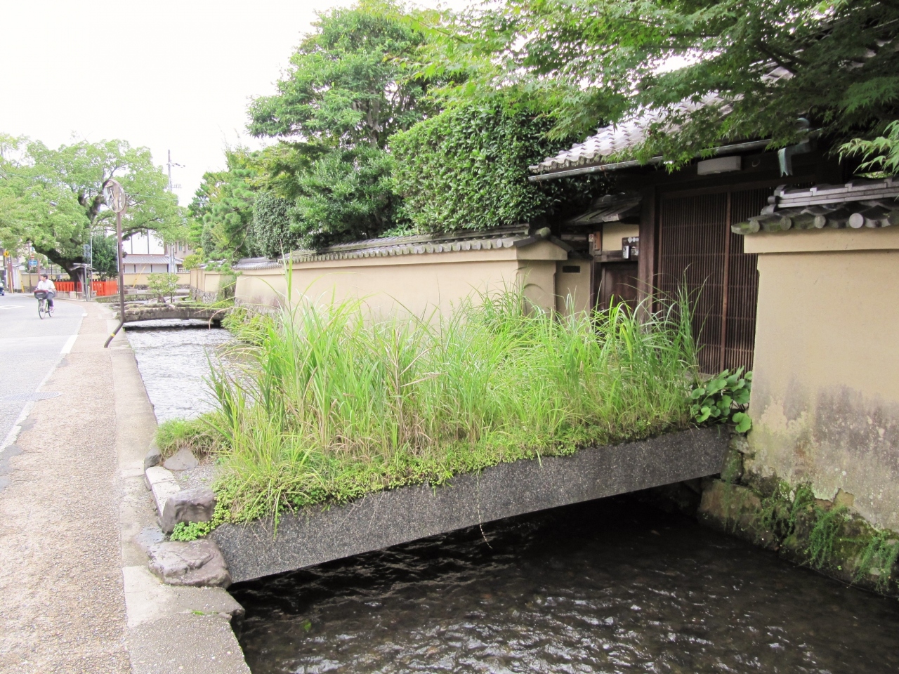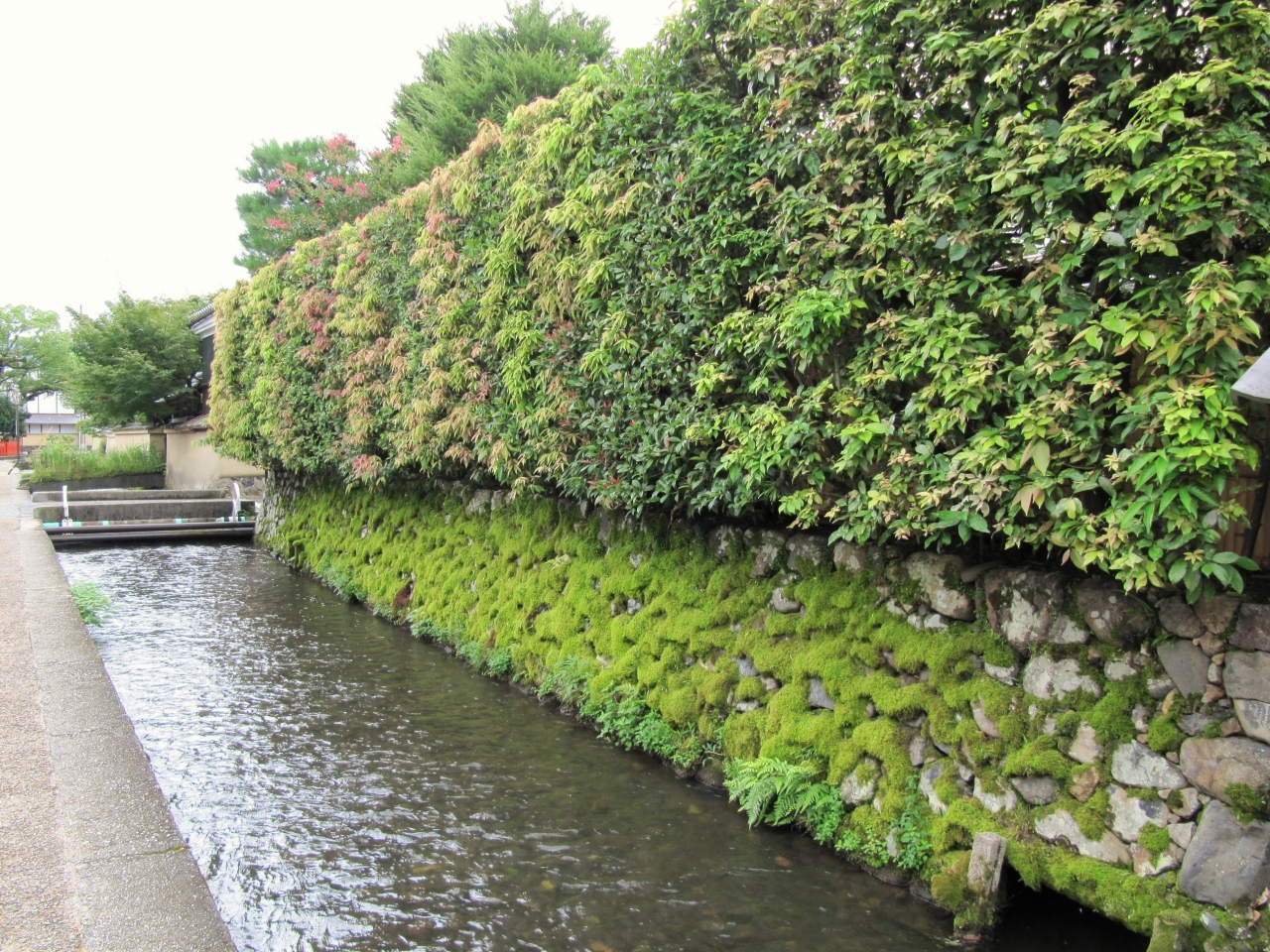明神川の流れと共に掛けられた石橋やその石垣を覆い尽くす苔に生垣などが昔ながらの京の町の風情をもたらしています。