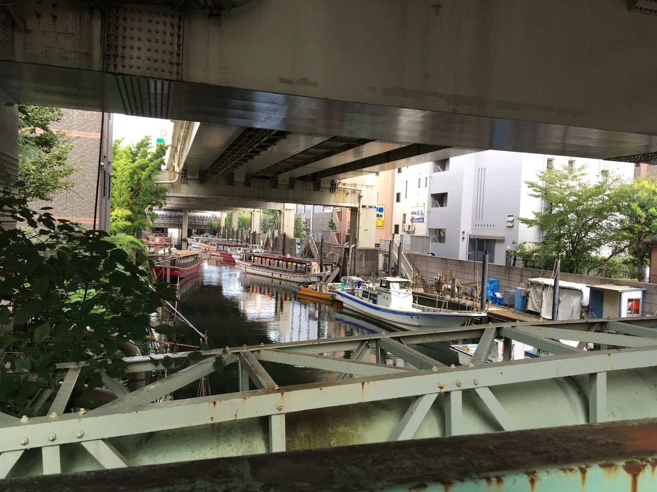 JR浜松町駅を出て、大門駅とクロスする第一京浜をまっすぐ進むと古川に架かる金杉橋が見えてきます。すぐ近くが公園になっていて、休憩している人たちがいました。川には屋形船が数台停泊しており、橋の上からその様子を眺めることができます。