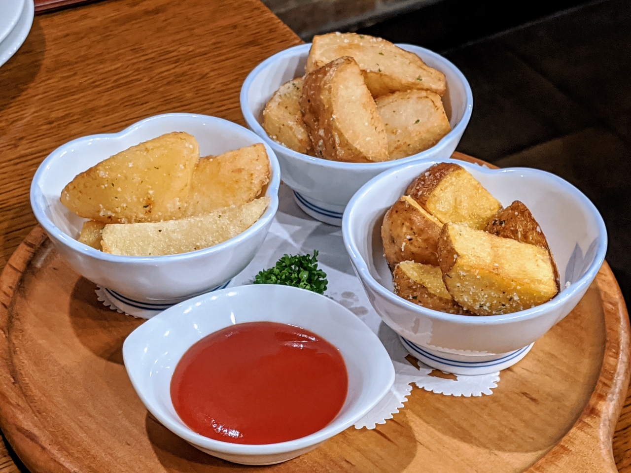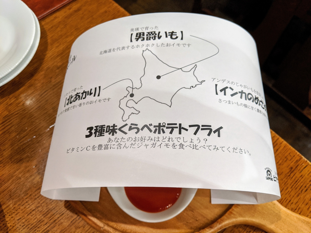 北海道・札幌市、札幌ファクトリーにある「ビヤケラー札幌開拓使」にコロナ渦前に行きました。こちらは、日本のビールの発祥の地にあるビアホールだそうです。11種類の生ビールと北海道の味覚を満喫する事が出来ます。本日はビールについて。サッポロですのでもちろん「クラシック」も良いのですが、こちらでは「クラフトビール飲みくらべセット」を是非試してみてください。「ろ過」「無ろ過」「アルト (上面発酵)」の3種類を試せます。私は「ろ過」が好みですね。この「ろ過」はサッポロビール創業当時の味を再現したビールだそうです。おつまみもなかなか楽しめます。オススメは「3種味比べポテトフライ」。「男爵」「北あかり」「インカのめざめ」の3種類のポテトフライです。それぞれ個性がありますが、私は男爵が一番しっくりきました。また、北海道産ししゃもの南蛮漬けも、本物ししゃもが食べられなかなか良かったです。是非!