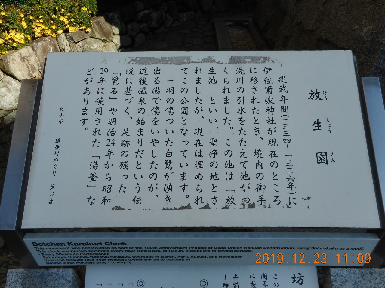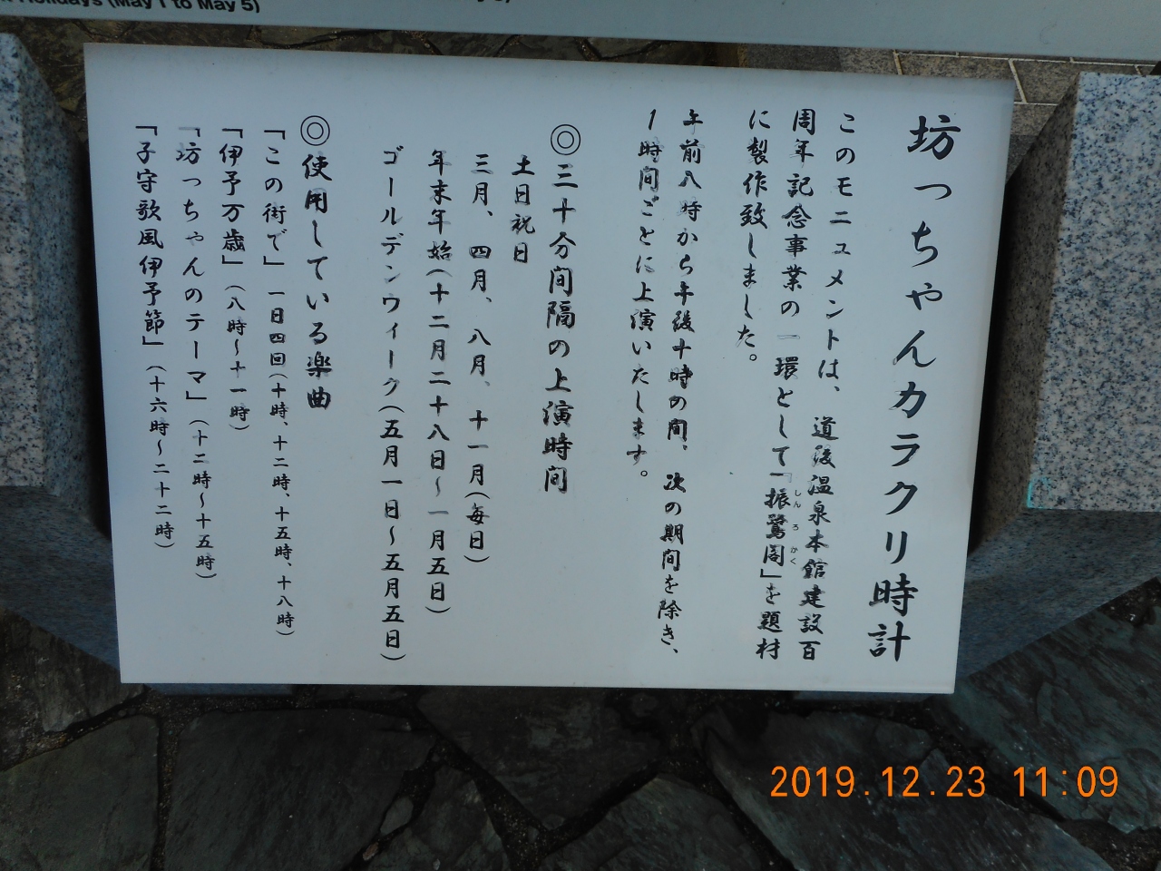 四国松山観光で立ち寄りました。伊予鉄松山市駅線で道後温泉駅下車して数分のところにあったのが放生園と言う広場です。広場の名物は何と言っても坊っちゃんカラクリ時計でした。それ以外にも足湯や句碑、昔の野球選手スタイルの正岡子規像など盛りだくさんでした