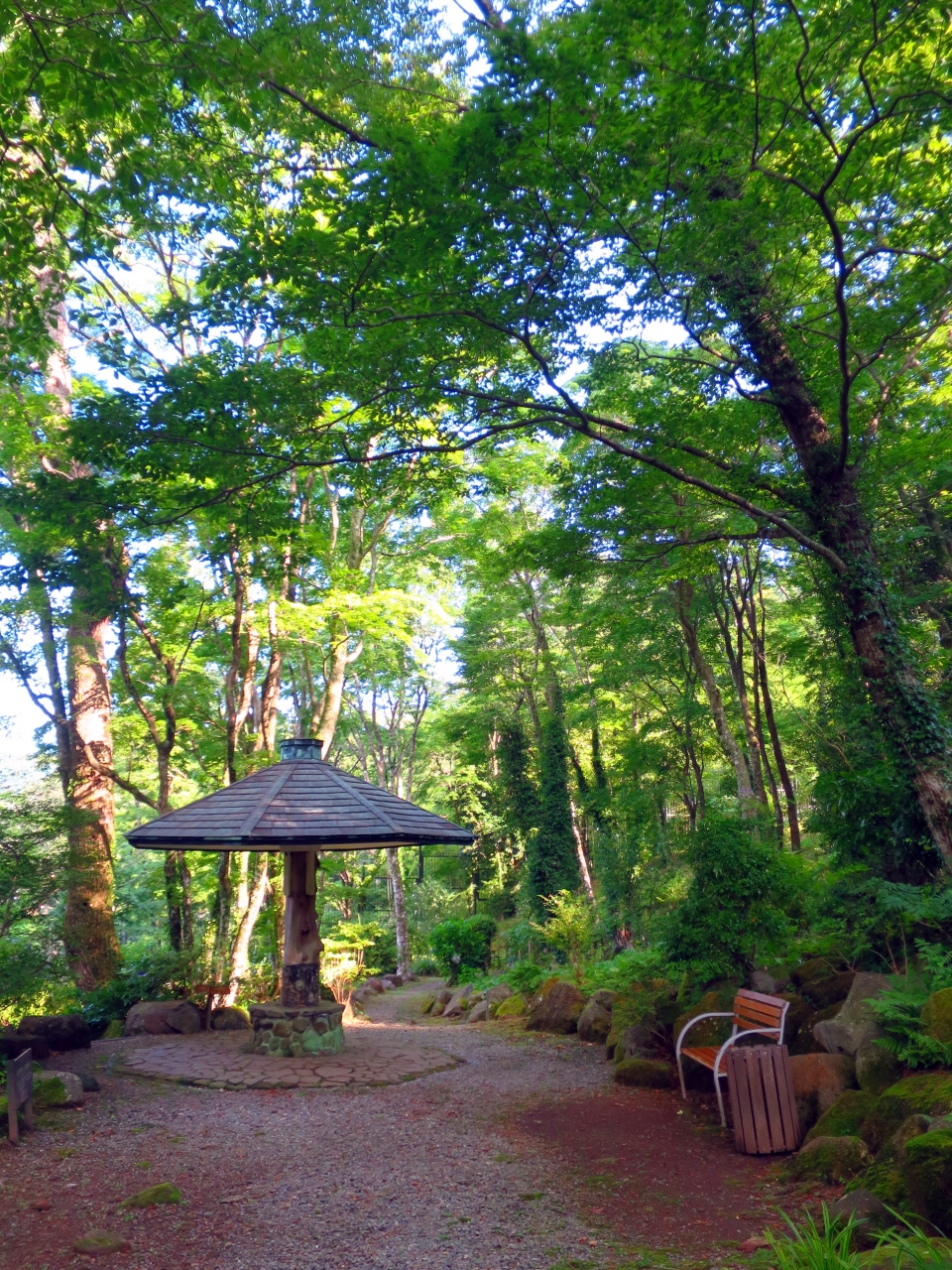 The garden is structured as if you were strolling through a forest. It's not a purely Japanese-style garden, but it is a perfect place to relax while listening to the rustling of leaves and the sound of water. The garden makes good use of the slope, and there are benches everywhere for resting. On the other hand, mosquitoes are likely to occur, especially in summer, due to the many water features. When strolling in the garden, it is necessary to wear long-sleeved clothes to protect yourself from insects.
