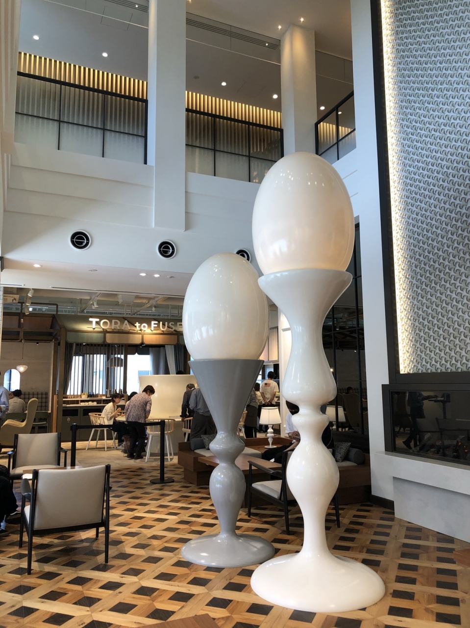 巨大なテーブルや椅子、赤いブタさんのオブジェ、春華堂の紙袋などなど~