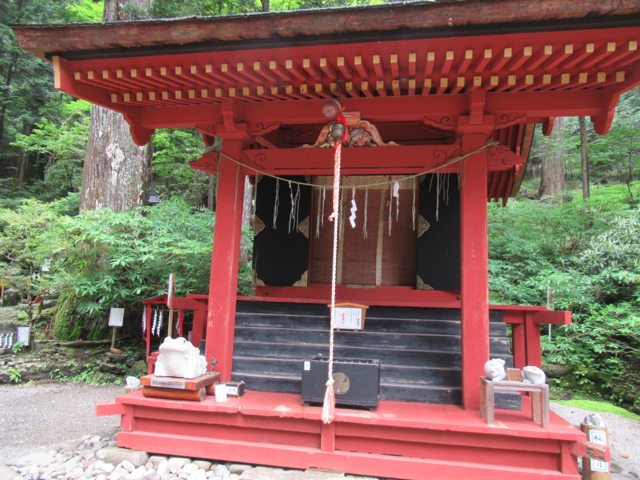 二荒山神社の有料エリア、神苑にあります。二荒山神社には縁結びにご利益のあるスポットが点在していますが、こちらの朋友神社は学問・知恵の神様だそうです。神苑に入って、直進した突き当りの場所に小さな社が建っていました。可愛らしいカエルの置物がとても目立っていました。