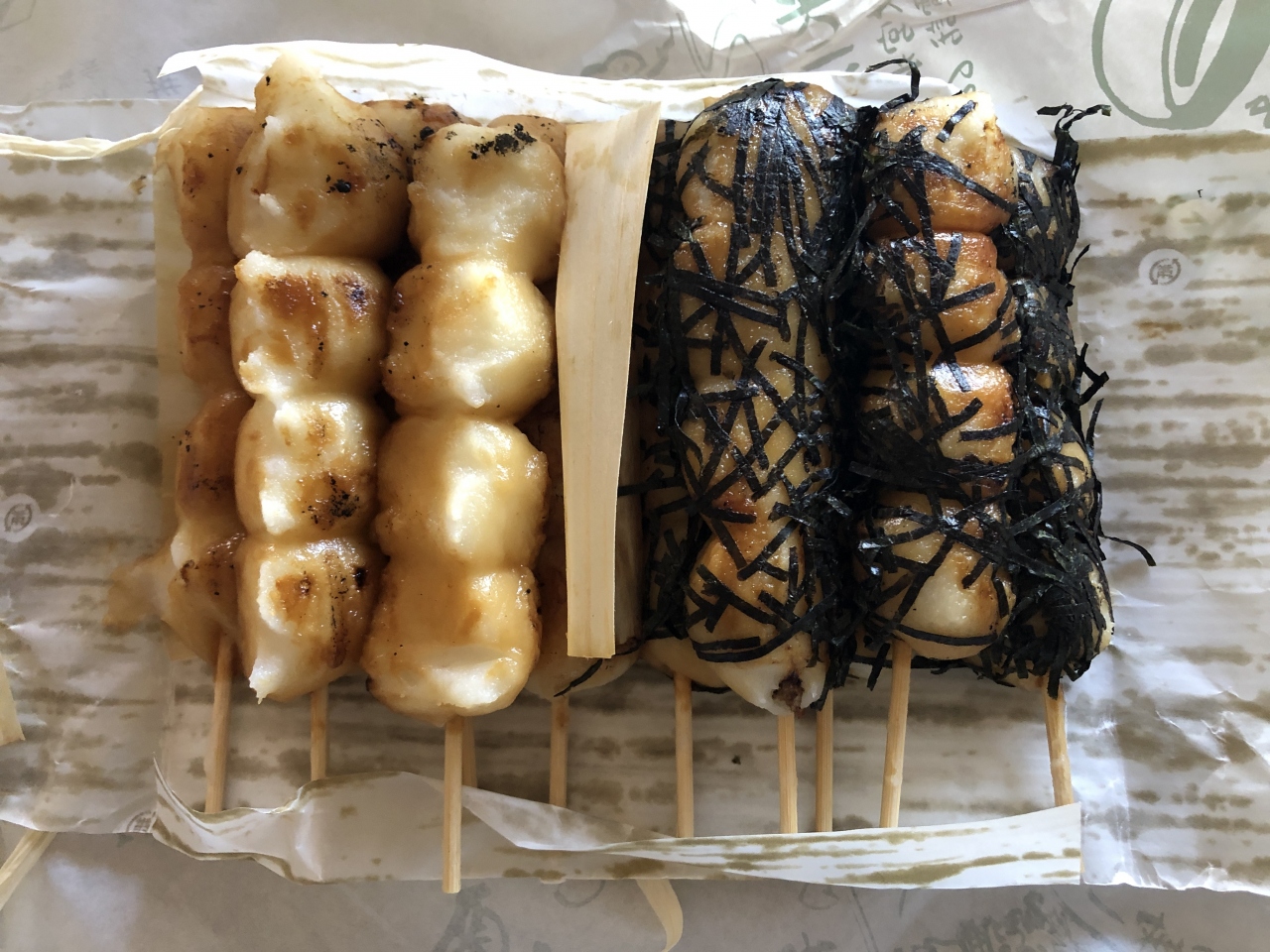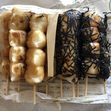 おだんごはおしょうゆ系の甘味のない焼だんごで、とても柔らかく美味しい。その柔らかさゆえ、持ち帰ると包装紙にペタッと付いてしまい開けにくく形が崩れてしまう…のですが味は美味しいです。1本は別に買ってその場で食べるのもいいかも知れません。