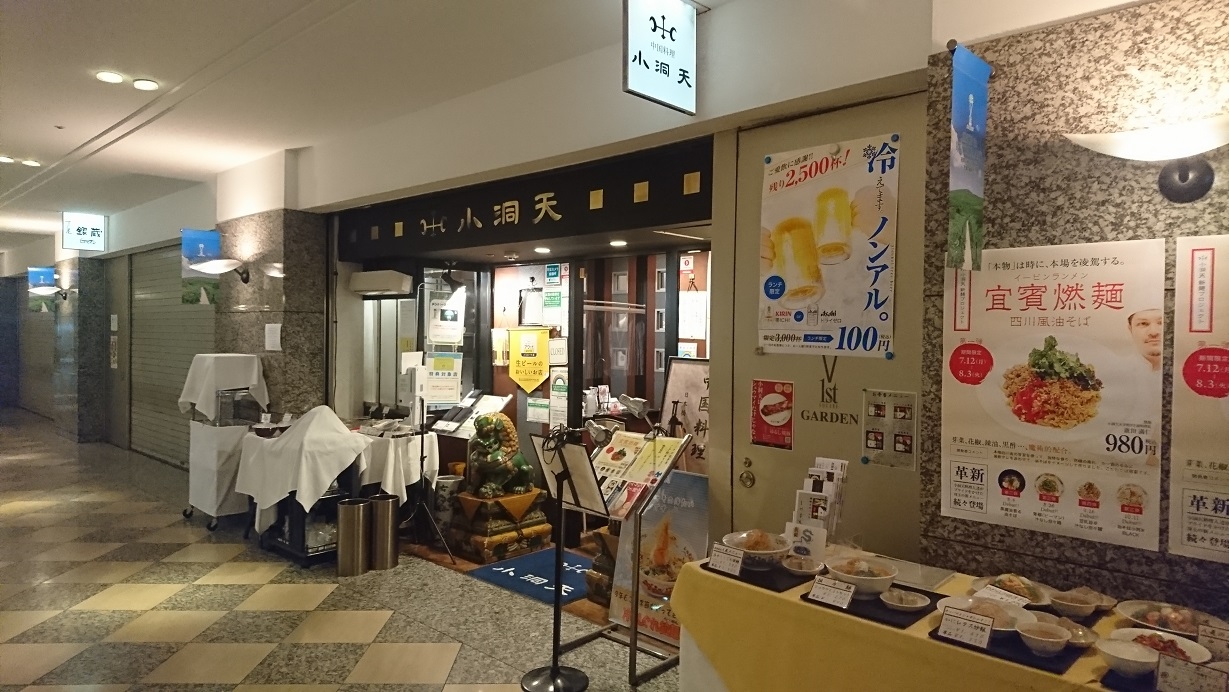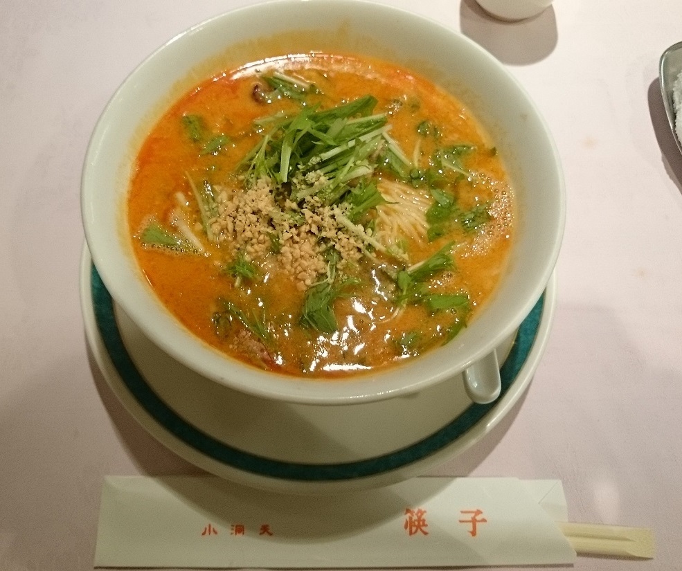 大手町ファーストスクエア地下1階レストラン街にある中華料理レストランです。夕食で担担麺をいただきました。具は挽肉、水菜、チャーシューで、やや細めの麺とほとんど辛みの無いスープの担担麺です。スープは上品な味付けでさっぱりとした中にも奥深い味。辛さ不足は残念でしたが、旨味のある美味しいスープで、さすがは高級中華料理店・小洞天のスープだな!という印象です。