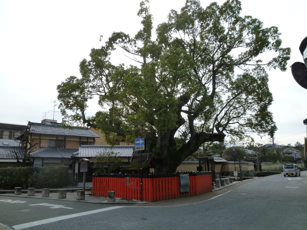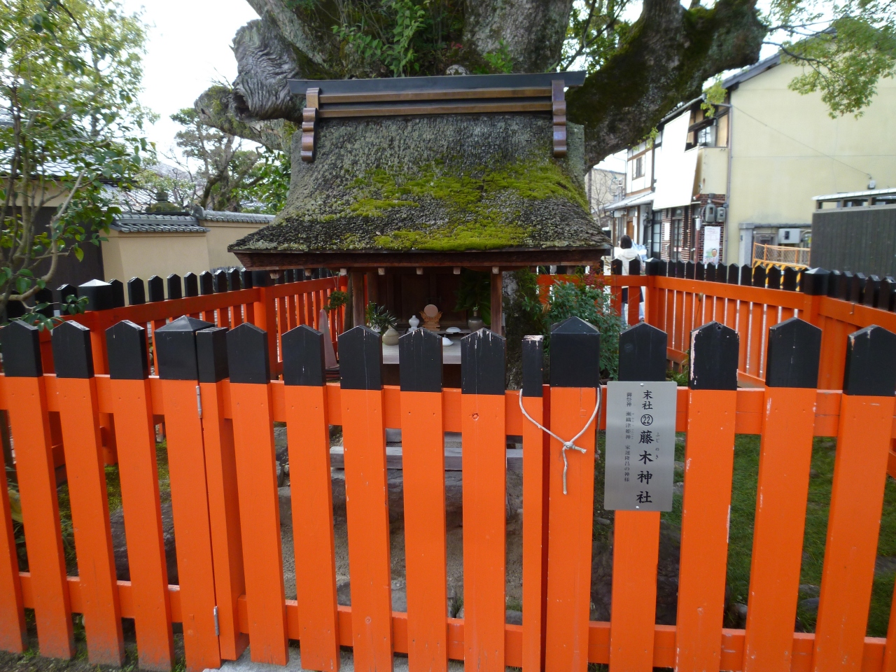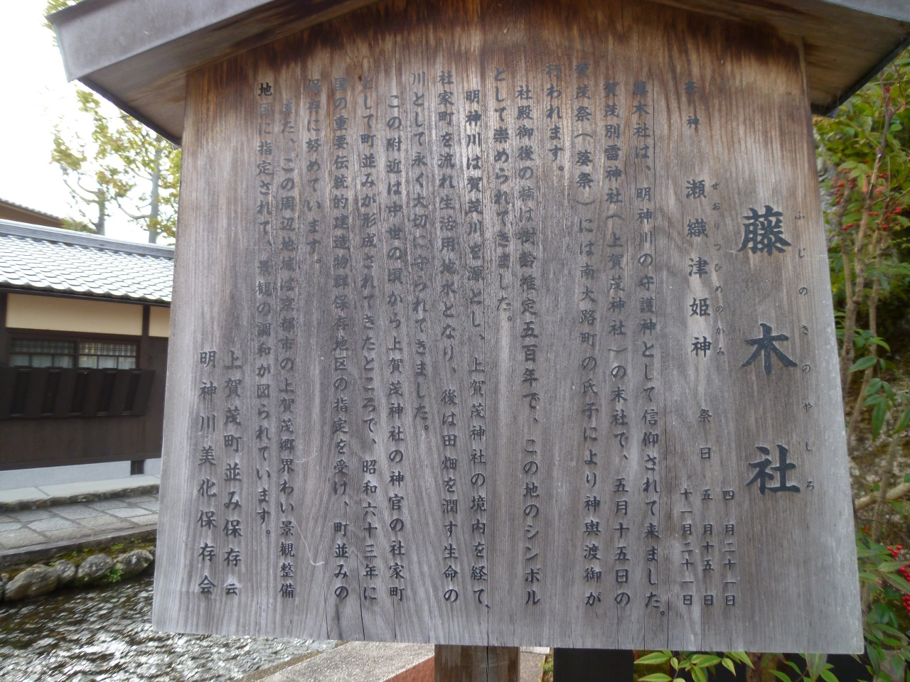 藤木社は、上賀茂神社の境外末社で明神川のほとりにあり、瀬織津姫神をご祭神としています。横を流れる明神川の守護神として、昔から地域の人々に厚く信仰されてきました。見どころは、隣に鎮座している樹齢500年といわれる楠の大木です。上賀茂伝統的建造物群保存地区である社家の町並みにマッチして、とてもいい感じの情景をかもし出しています。明神川のせせらぎも綺麗でした。