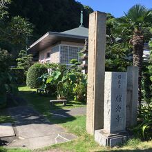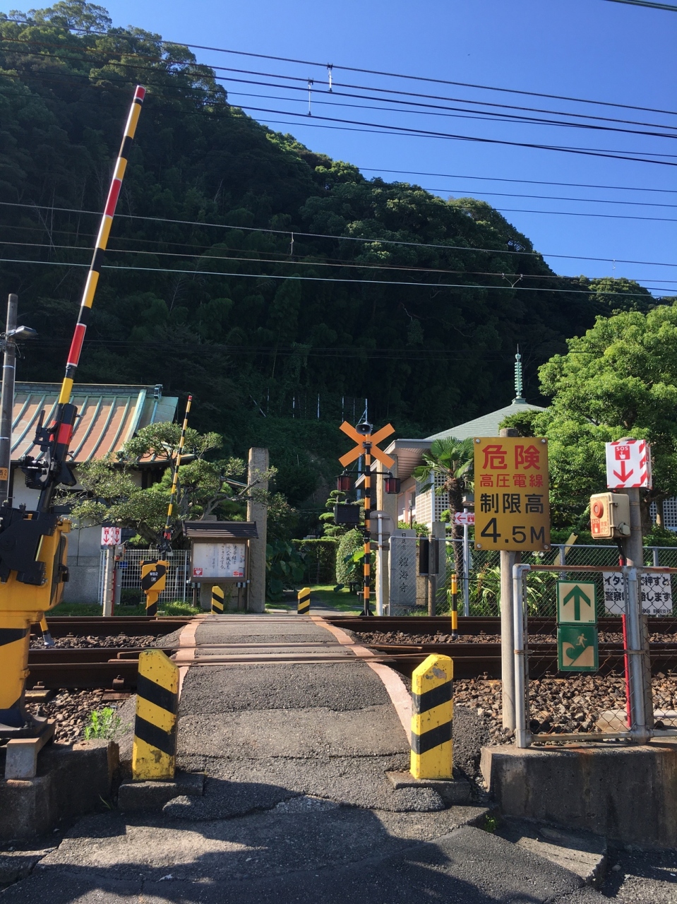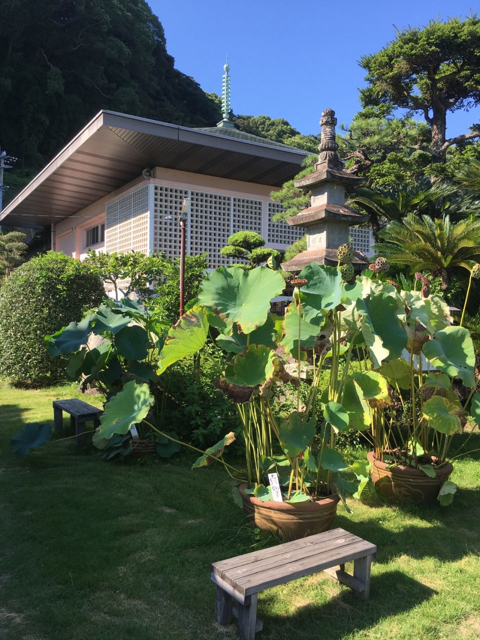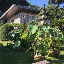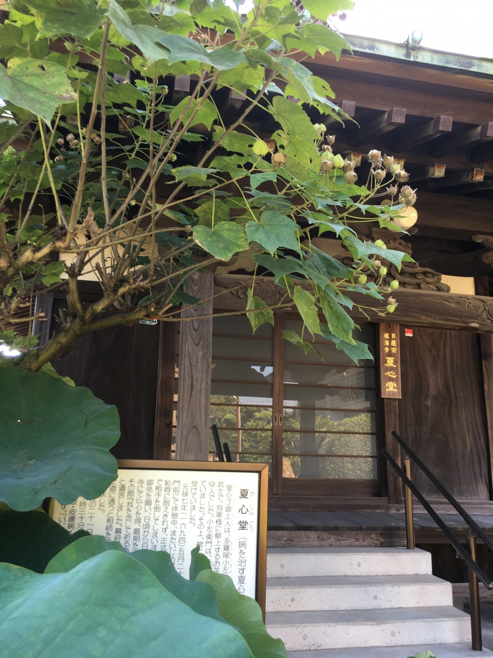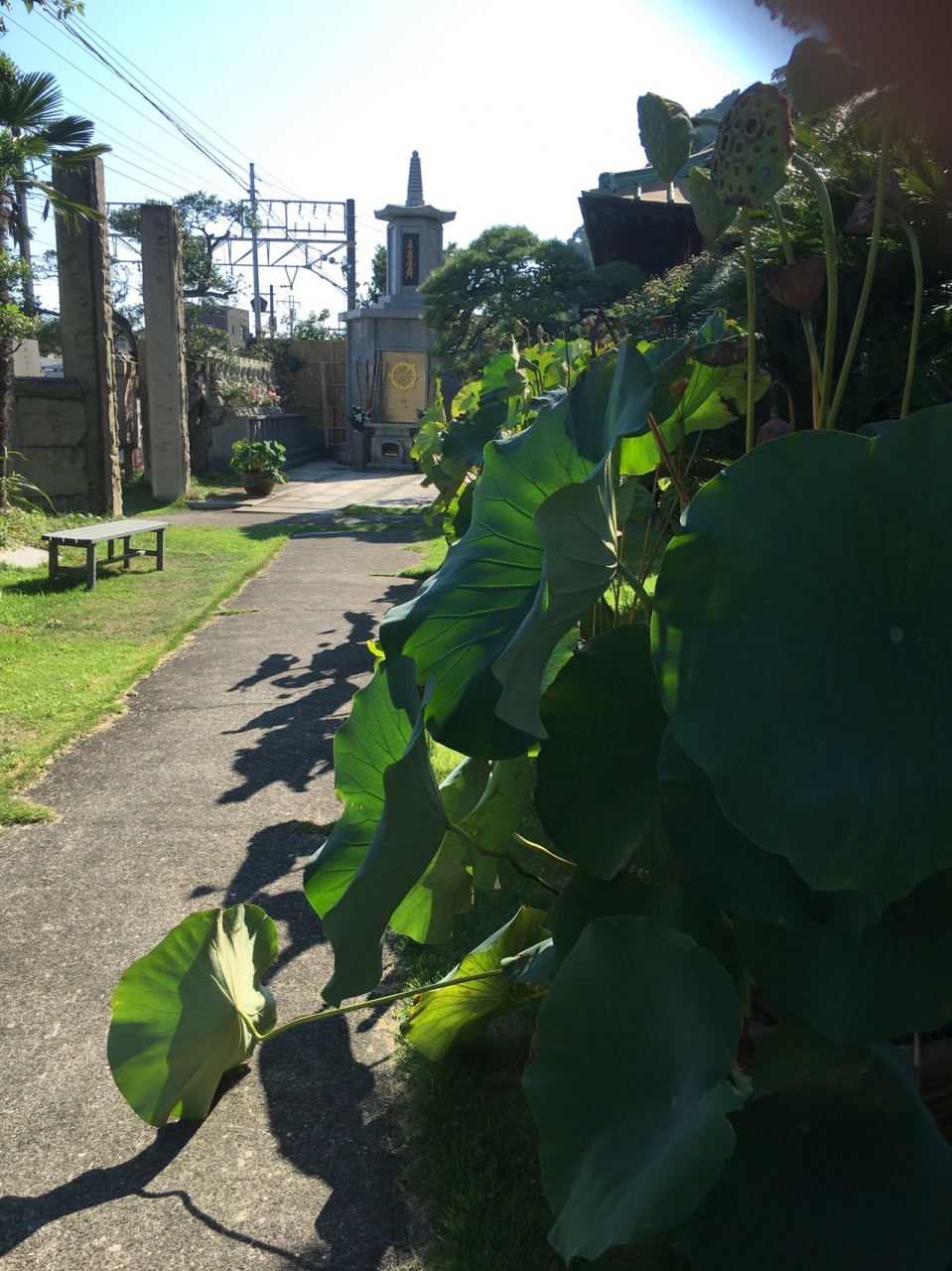 踏切渡り直ぐにお寺がありました。境内の芝生の緑色が鮮やかで本殿は東南アジア風の建物でした。草木が整備されて生えてあり、夏心堂と言う建物が風情が入りました。本堂の奥がお墓で、電車の音が時たま聞こえる寺でした。