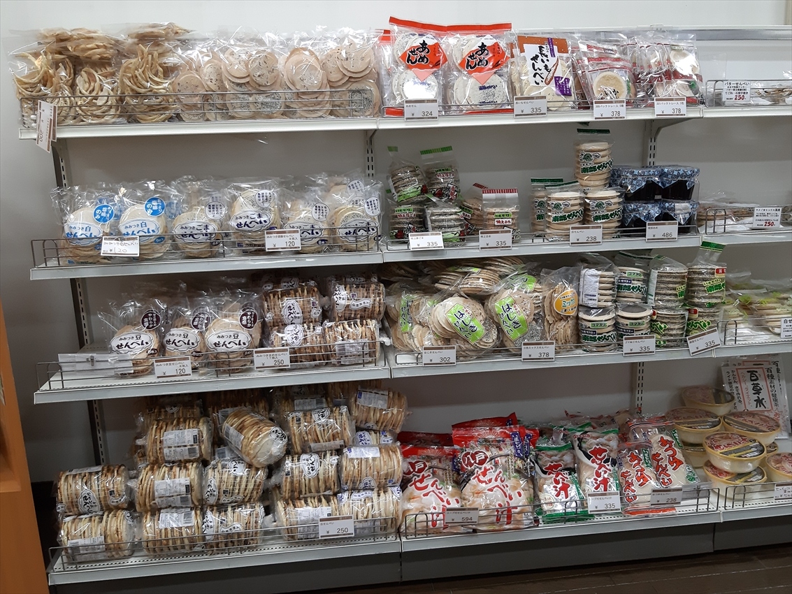お土産品を見て回っていると、いろいろな南部せんべいでいっぱいの棚を発見!