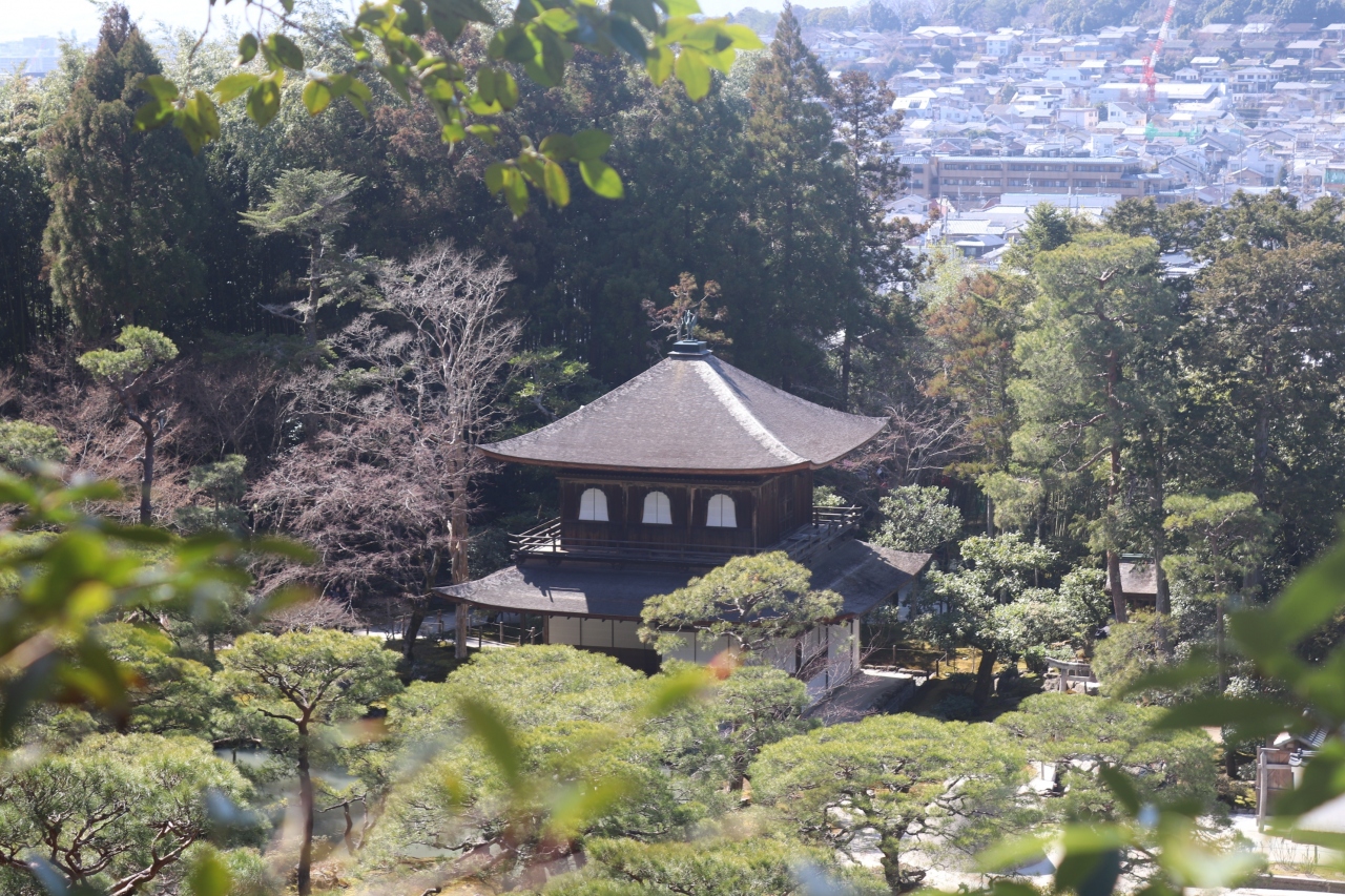 京都の代表的な観光地で世界遺産の構成資産のひとつでもあります。見学ルートに沿って回ると錦鏡池の中心とした回遊庭園の奥、東求堂裏手はアップダウンも多く、かなりの運動量です。山から見下ろす銀閣も美しいです。