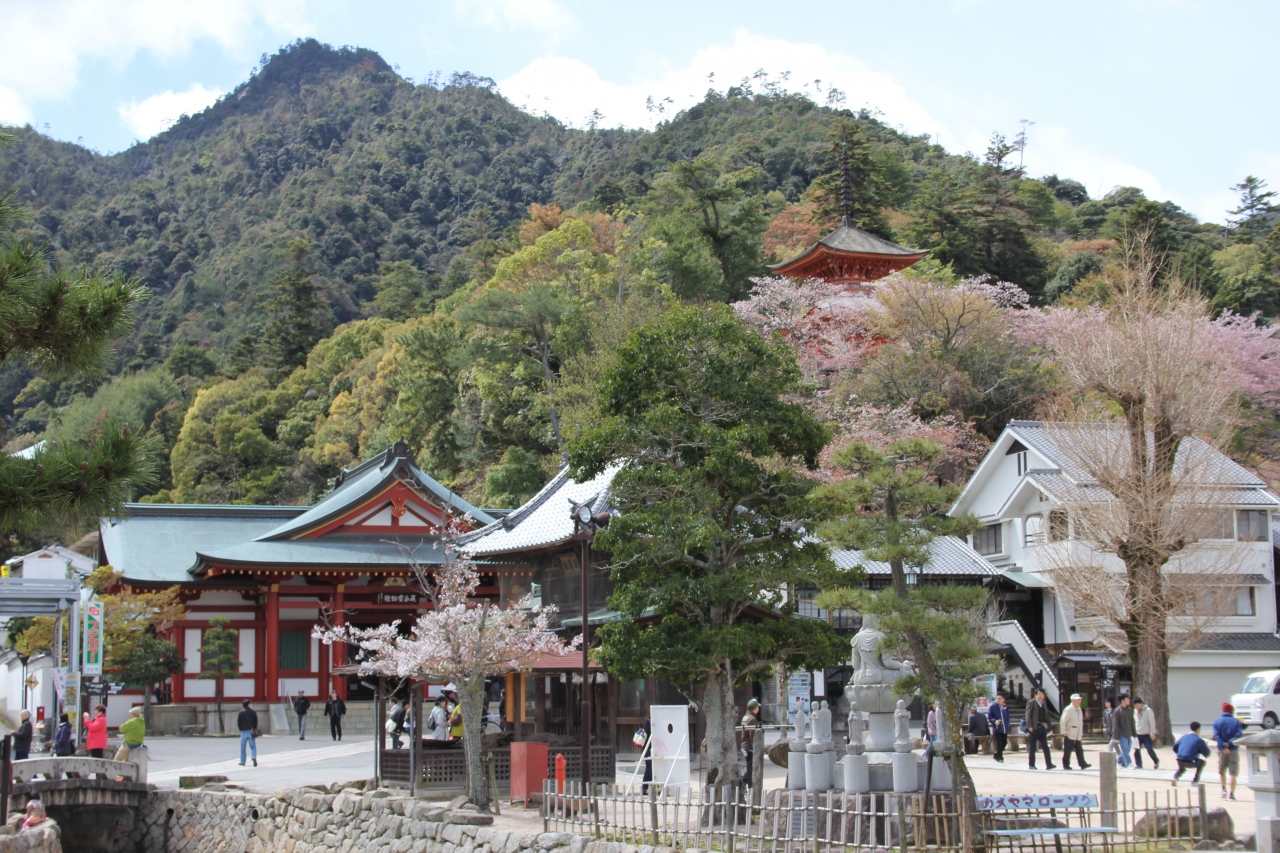 宮島の高台にある純和様式の外観の二重の塔で、今は厳島神社に属します。大元公園に向かう遊歩道の途中にあり絶景とはいえませんが、大鳥居や瀬戸内海を見下ろすことができるので、厳島神社見学の散策にお勧めです。