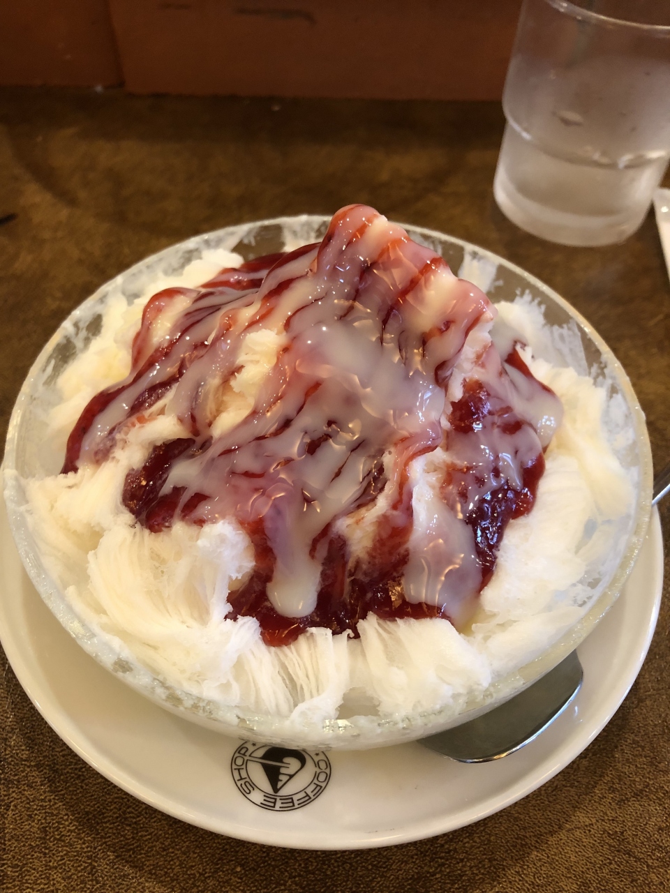練乳苺ミルクのかき氷を食べました。氷そのものに練乳ミルク味がついていて、かき氷のシャリシャリ感ガリガリ感はなくて、やわらか~い不思議な食感。食べているうちに氷が溶けて水になるなんてこともなく、冷たさで寒くなったり、頭がキーンとなったりすることもなかったです。