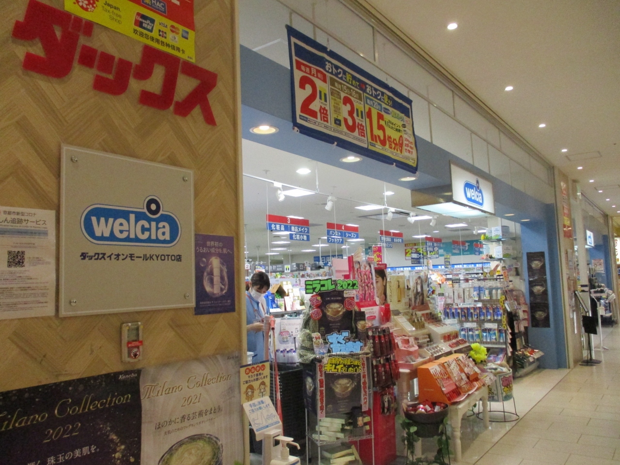 イオンモール京都の1階にあるドラッグストアです。今回西側の入り口からイオンに入ったのですが、入ってすぐのところにありました。よくあるドラッグストアですが、広くて取扱商品も多いです。薬、日用品、化粧品など。店頭には熱中対策グッズが並んでいました。JR京都駅から近いので便利です。