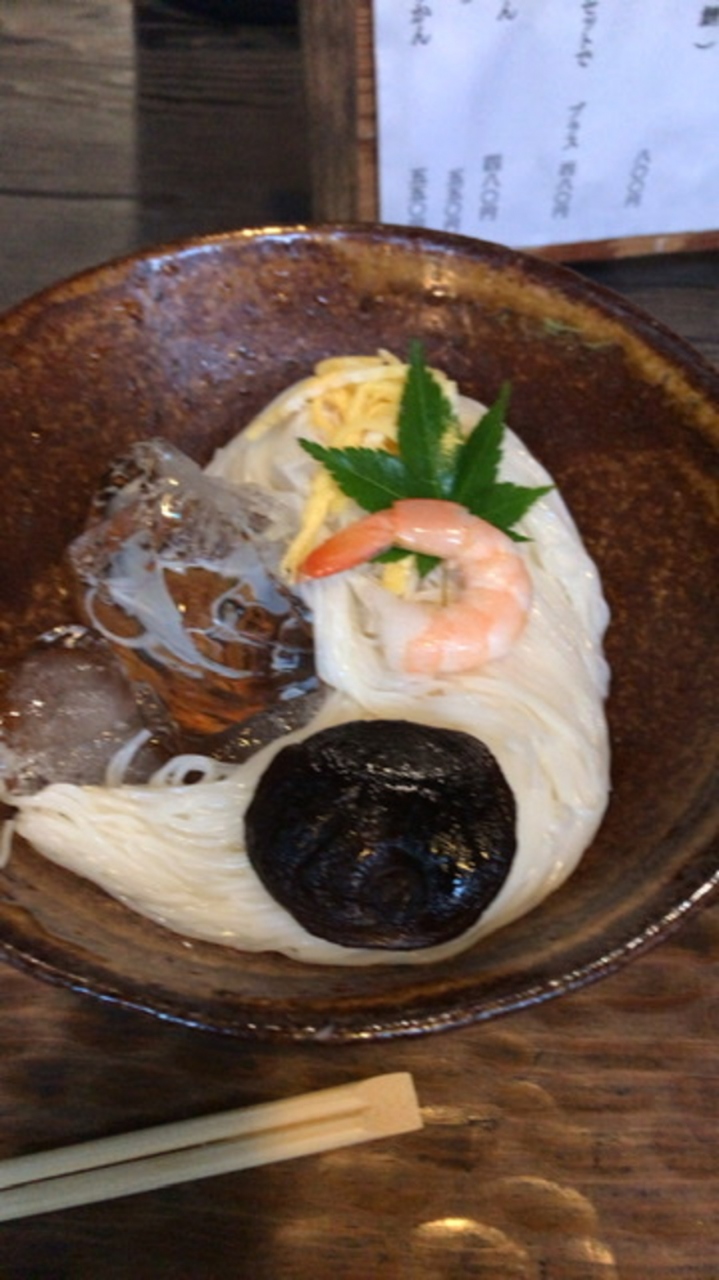 2把分(たぶん)のそうめんが、氷の入った器に。具は海老、椎茸、錦糸卵。薬味は生姜と葱。