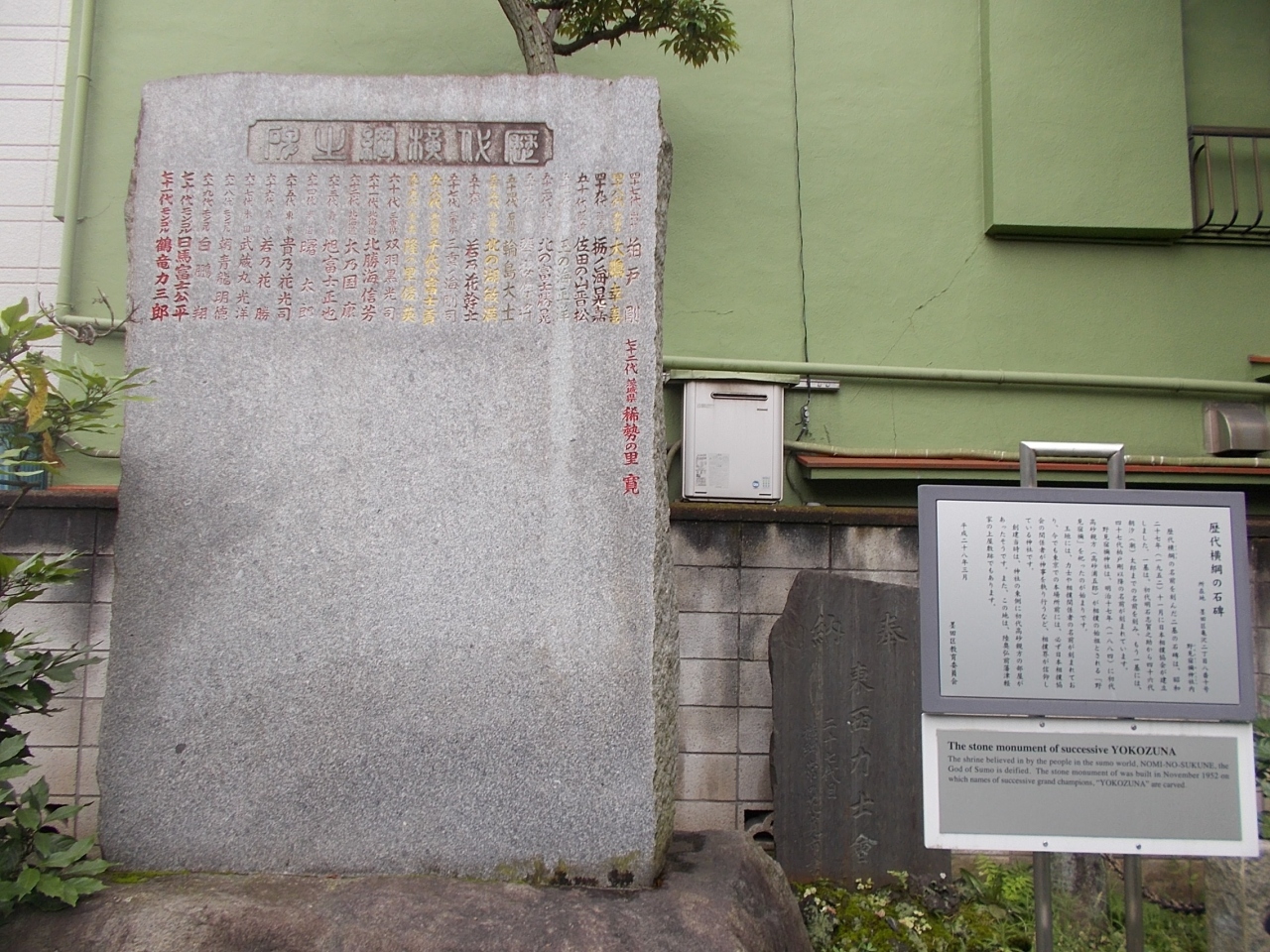 この歴代横綱の碑は野見宿禰神社の境内に在ります。地下鉄都営大江戸線両国駅から東に5分強の場所にあります。もとは津軽藩上屋敷の敷地の一角です。この碑は戦後たてられたのです。石碑の脇には説明板もあります。相撲部屋がある両国の中でも存在感がある石碑です。