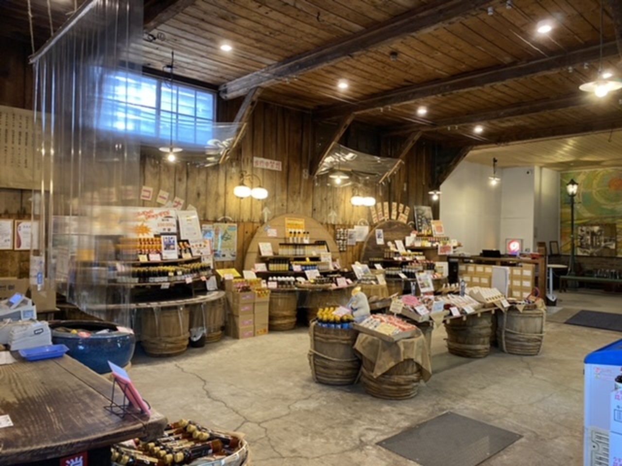 文化財の様な古い建物の中に、売店があります。主に醤油、ドレッシング、だし醤油、アイスクリームが売ってます。万能調味料系があるとなお良いなと思った。小ぶりな容器のものも多くお土産用、贈答用に良い品揃えだと思った。時節柄なのか、半額など割引されてるものも多かった。せっかく歴史的な建物で営業されてるので、少しだけでも昔のお店としての逸話、経歴も掲示があると良いと思う。