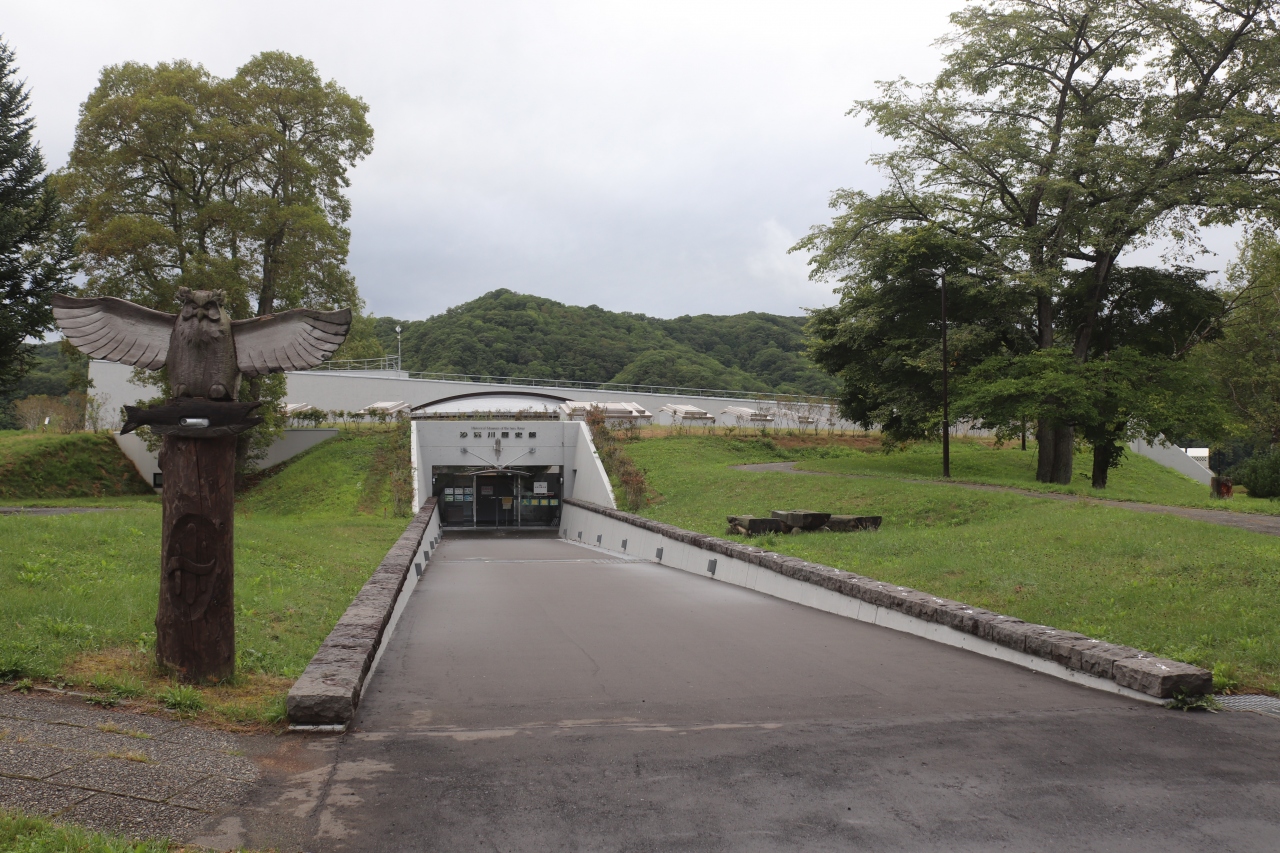 二風谷コタン、平取町立二風谷アイヌ文化博物館のすぐ裏、沙流川のダム湖に面した無料の見学施設です。もともと、日高のアイヌ民族は沙流川流域で多く集落があったそうです。残念ながらコロナ渦で閉館していました。