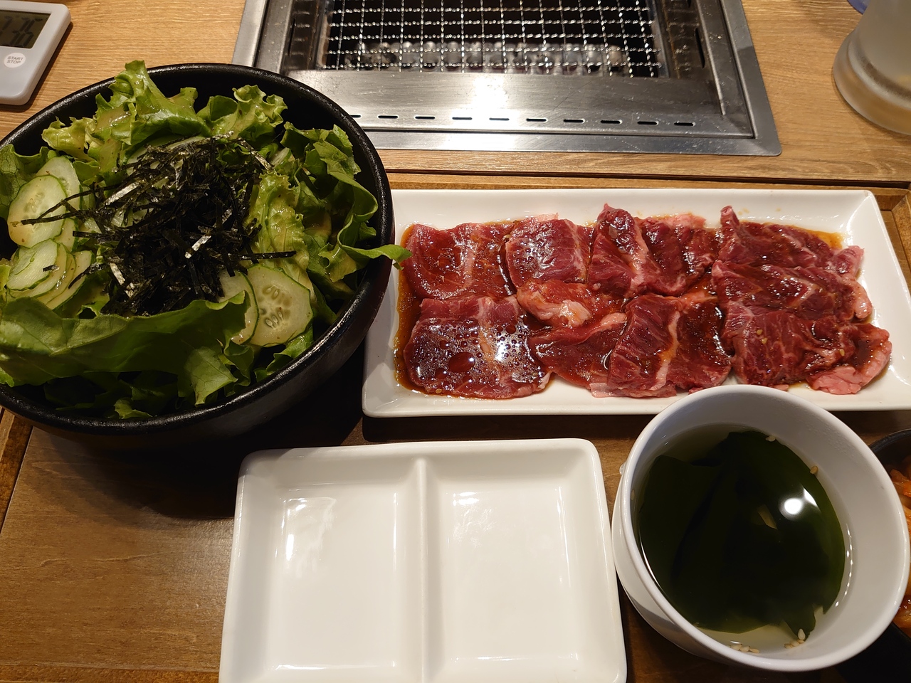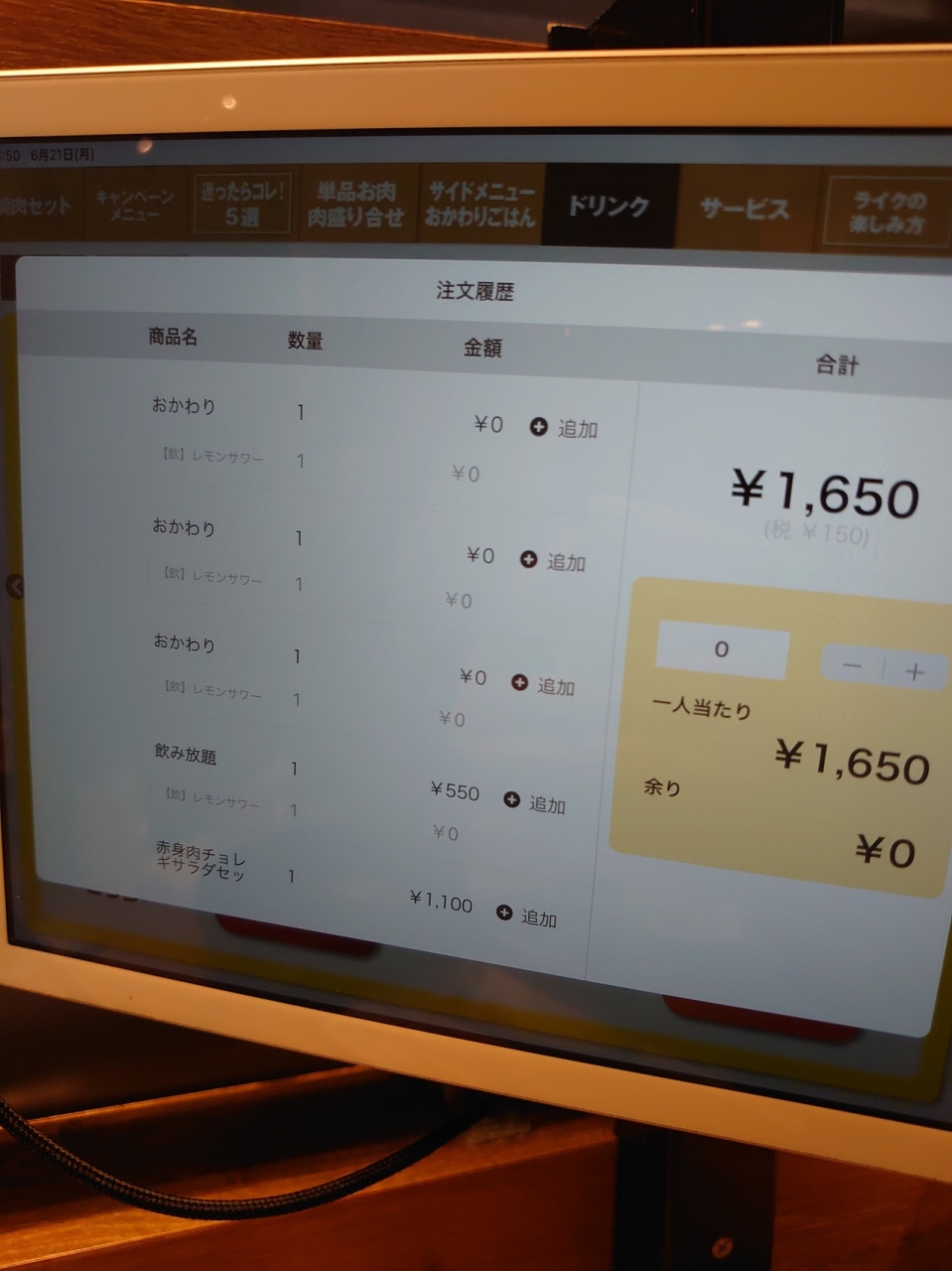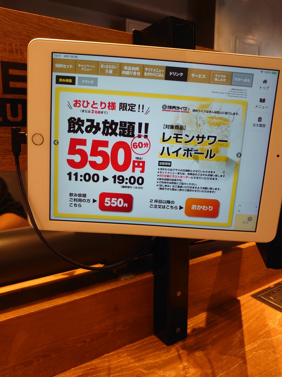 タッチパネルで飲み放題と赤身肉とチョレギサラダセットを注文。