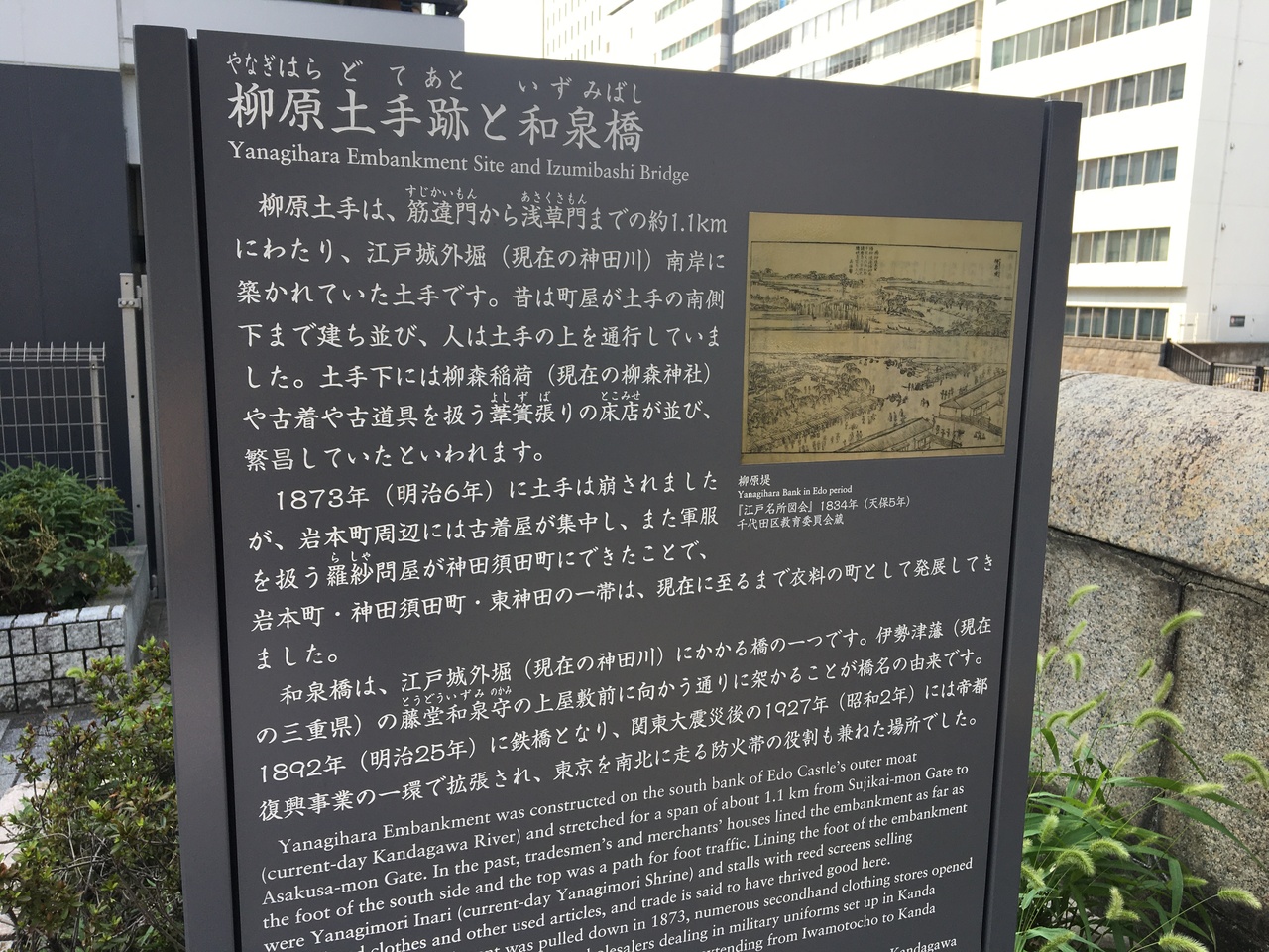 秋葉原エリアを散歩中、柳森神社に向かう途中で訪れました。「柳原土手跡と和泉橋」と書かれた案内板があるので、すぐに分かると思います。江戸時代に、神田川の土手は柳並木があったことから、「柳原土手」と呼ばれていたそうです。今でも、このエリアには柳の木を多く見かけました。