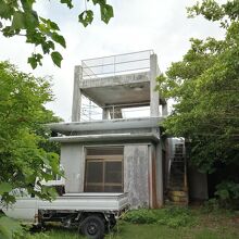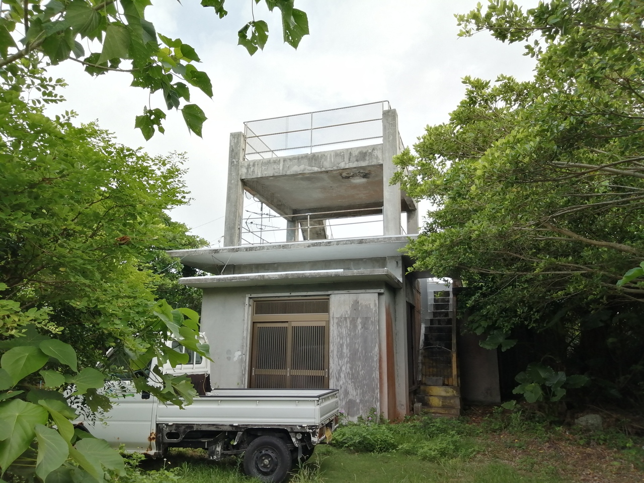 「ンブフルの丘」の上に建つ展望台です。丘の下の道からでは見えないのでその存在に気づく方は少ないと思います。“由緒板”から数メートル上がった所に登り口がありますが藪の先の鉄扉はクローズ。登り口から30m先には民家の入口があり、少しおじゃまして覗いてみたらありました、“展望台”が…。しかし現在は利用されていない様子。人の気配はなく住んでいるのか、いないのか…(倉庫かもしれません)。人がいれば事情を聞けるのですが…。諦めて引き返しました。