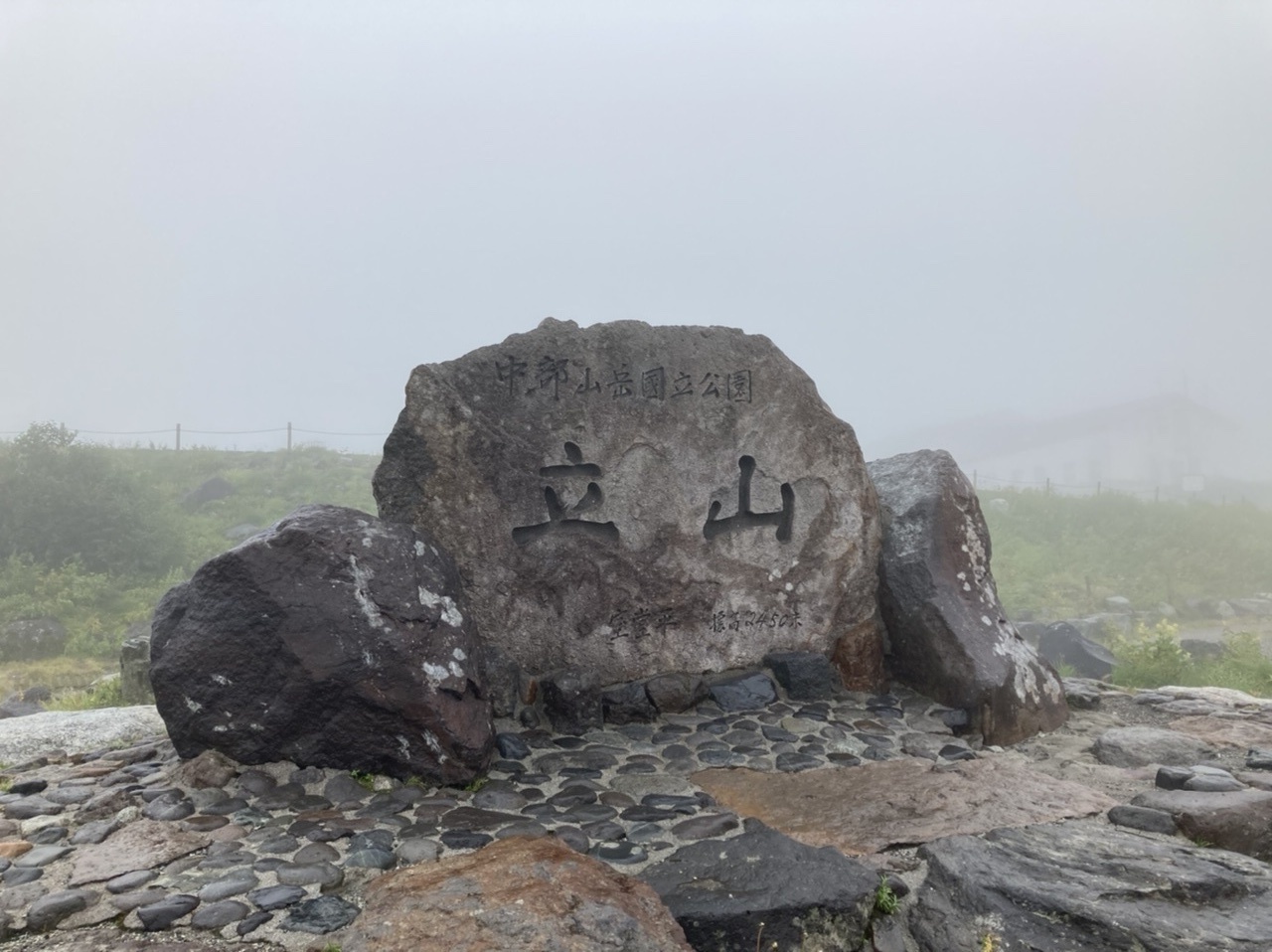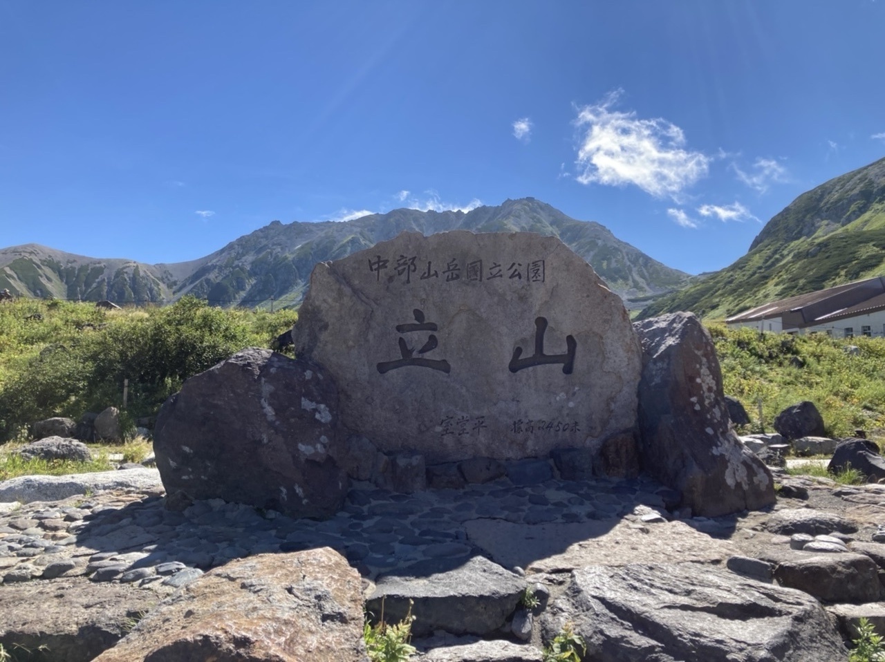 バスを降り、ターミナルの裏に回ると、立山が目の前に現れます。"立山"の石碑の前で、記念写真。気持ちいい景色です。