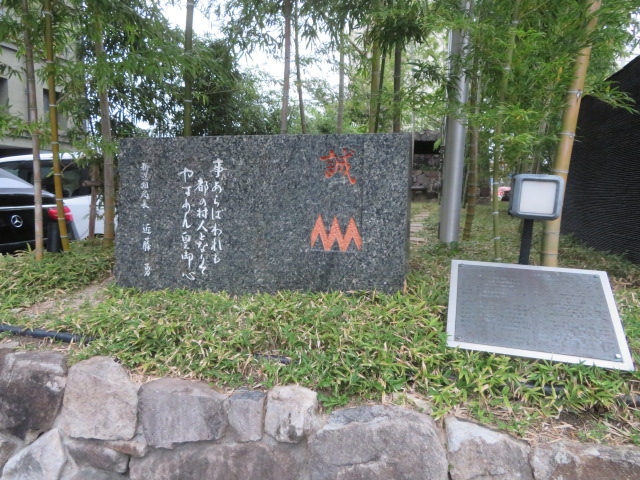 京都駅から徒歩圏のリーガロイヤルホテルの正面横の植え込みにあるのですぐに見つけられます。説明文はありますが、何が書いてあるのかわかりません。黒い石碑に、新撰組局長の近藤勇の言葉が書いてあります。何かあれば、私も頑張るという趣旨のもので、現代に生きていてほしい人だと思いました。