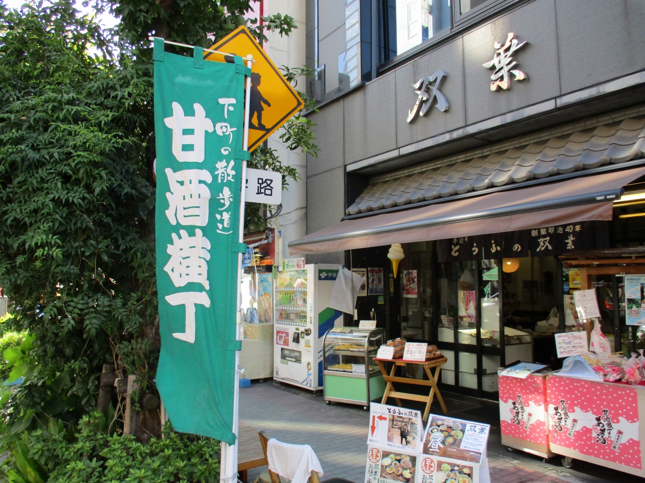 日本橋人形町から浜町に向かって散策していた時に、甘酒横丁を通りました。緑色の幟旗には下町の散歩道と書かれていましたが、確かにどこか懐かしい風情を感じさせる雰囲気でした。鯛焼き屋さんや、明治座に観劇する方用の折詰の寿司屋さんなどもありました。