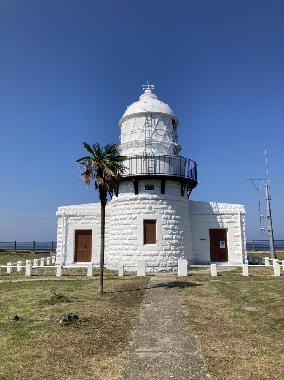 灯台までは、車を近くの道の駅に停めて歩きました。遊歩道の入り口は分かりにくいですが、そこからは、階段を登り、登り切ると、整備された遊歩道、100mも行くと、その白亜の灯台は現れます。