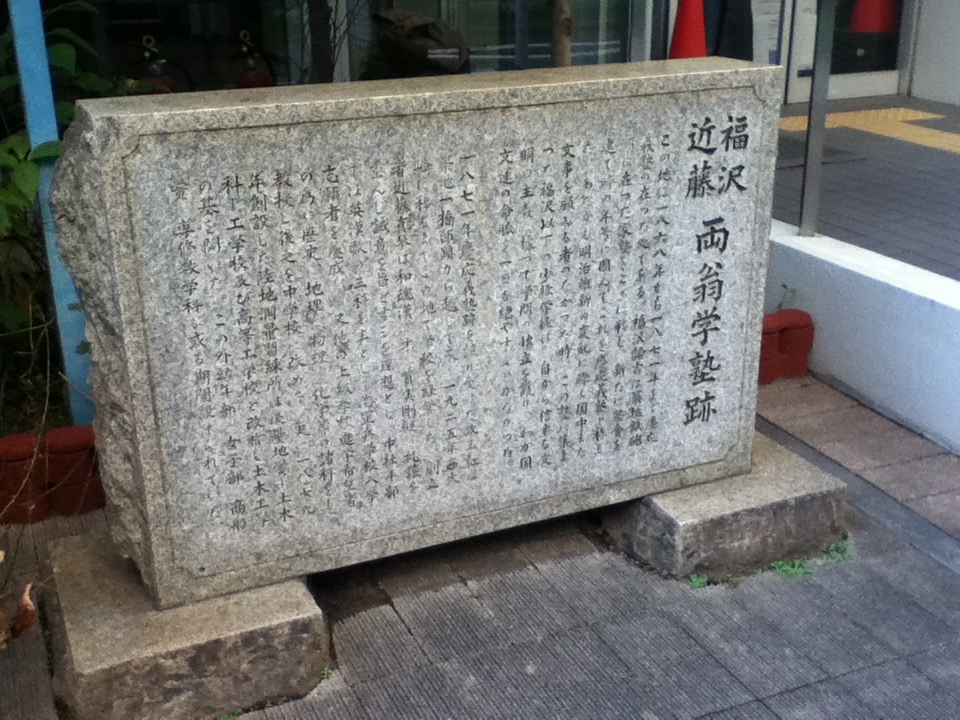 大門駅北東のエコプラザの植え込みにこちらの石碑が立っている。お勧めの点は、福沢諭吉が慶応4年(1868年)蘭学塾を築地からこの地に移転し移転した元号にちなんで慶應義塾と名づけたこと、その後学生が増えて来た為に明治4年に現在の慶應義塾がある三田の島原藩邸跡に移転したこと、その跡地を近藤真琴が経営していた攻玉社に譲り渡し攻玉社は大正14年までこの地で経営していたことである。訪問時の感想は、石碑は直方体で名称や碑文がしっかりと刻まれている。石碑と見て慶應義塾や攻玉社がかつてあったことを知ることができ訪問して良かった。