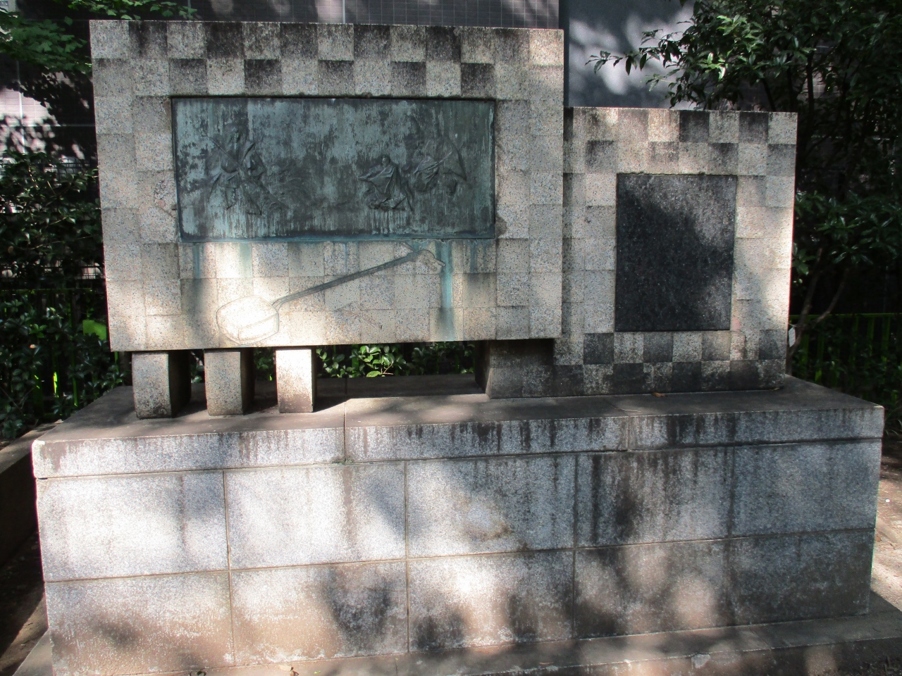 散歩をしていて休憩で立ち寄った、小伝馬町近くの十思公園の中に、ひときわ大きくて立派な石碑が建てられていました。古典芸能の三味線で有名な杵屋勝三郎の石碑でした。石碑には三味線や歌舞伎での演奏の様子らしい姿も残されていました。