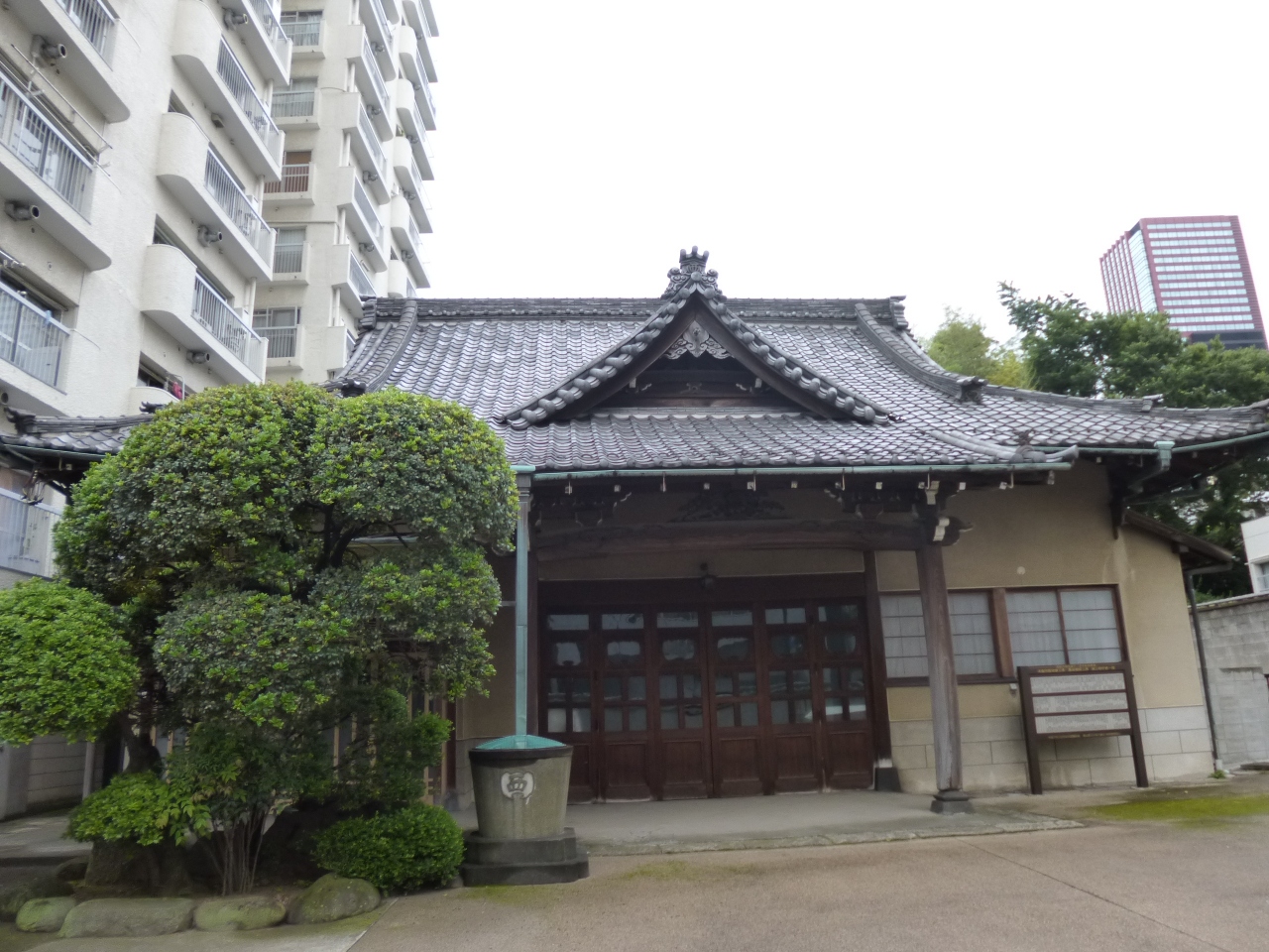 三田四丁目の交差点近く、桜田通り沿いにある天台宗寺院です。創建は1452とされ、お寺の多い三田界隈にあっても歴史ある寺院です。現在のお寺はいたってシンプルで、本堂、山門とも、パッと見ただけではお寺とは感じない、そんな外観でした。